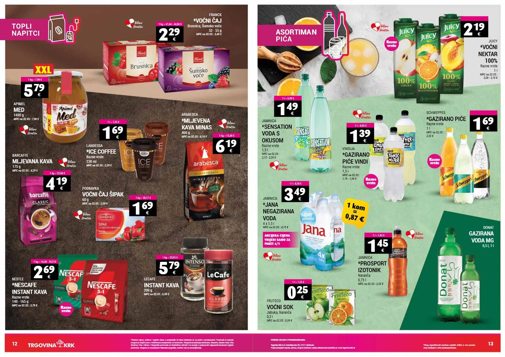 *sidrene cijene, snižene i najniže cijene u posljednjih 30 dana istaknute su na polici u prodavaonici. prozivode iz ponude moguće je kupiti samo u količinama primjerenim za kućanstvo. mogućnost plaćanja karticama: maestro, master card, visa electron, visa i diners. fotografije proizvoda su ilustrativne prirode i ne moraju u potpunosti odgovarati stvarnom izgledu proizvoda. moguće su nenamjerne tiskarske pogreške, molimo vas za razumijevanje. ponuda vrijedi u prodavaonicama: trgovina krk d.d. dubašljanska 80, 51511 malinska. popis prodajnih mjesta, adresa, brojeve telefona i ostale aktualnosti potražite na: www.trgovina-krk.hr *zbog ograničenosti prostora pojedini artikli, iz ove ponude, nosu dostupni u svim prodavaonicama. 13 12 asor tima n podravka voćni čaj šipak 60 g mpc na 02.05.: 2,59 € franck *voćni čaj brusnica, šumsko voće 52 - 55 g mpc na 02.05.: 3,49 € landessa *ice coffee razne vrste 230 ml mpc na 02.05.: 2,39 € arabesca *mljevena kava minas 400 g mpc na 02.05.: 8,19 € lecafe instant kava 200 g mpc na 02.05.: 6,99 € barcaffe mljevana kava 175 g mpc na 02.05.: 4,29 € apimel med 1400 g mpc na 02.05.: 7,96 € nestle *nescafe instant kava razne vrste 140 - 165 g mpc na 02.05.: 3,79 € 1 69 € 1 kg = 28,17 € 2 29 € 1 kg = 41,64 - 44,04 € 1 69 € 1 l = 7,35 € 6 19 € 1 kg = 15,48 € 5 79 € 1 kg = 28,95 € 4 19 € 1 kg = 23,94 € 5 79 € 1 kg = 7,96 € 2 69 € 1 kg = 16,30 - 19,21€ 3 49 € 1 l = 0,58 € 1 49 € 1 l = 0,99 € 1 69 € 1 39 € 1 l = 0,93 € 0 25 € 1 l = 1,25 € 2 19 € 1 45 € 1 l = 1,93 € jamnica *jana negazirana voda 4 x 1,5 l mpc na 02.05.: 4,15 € jamnica *sensation voda s okusom razne vrste 1,5 l mpc na 02.05.: 2,15 - 2,29 € schweppes *gazirano piće razne vrste 1 l mpc na 02.05.: 2,52 € vindija *gazirano piće vindi razne vrste 1,5 l mpc na 02.05.: 1,79 - 1,99 € fruteco voćni sok jabuka, naranča 0,2 l mpc na 02.05.: 0,39 € donat gazirana voda mg 0,5 l, 1 l juicy *voćni nektar 100% razne vrste 1 l mpc na 02.05.: 3,09 - 3,19 € jamnica *prosport izotonik naranča 0,75 l mpc na 02.05.: 2,39 € xxl razne vrste razne vrste razne vrste razne vrste 1 kom = 0,87 € akcijska cijena vrijedi samo za paket 4/1