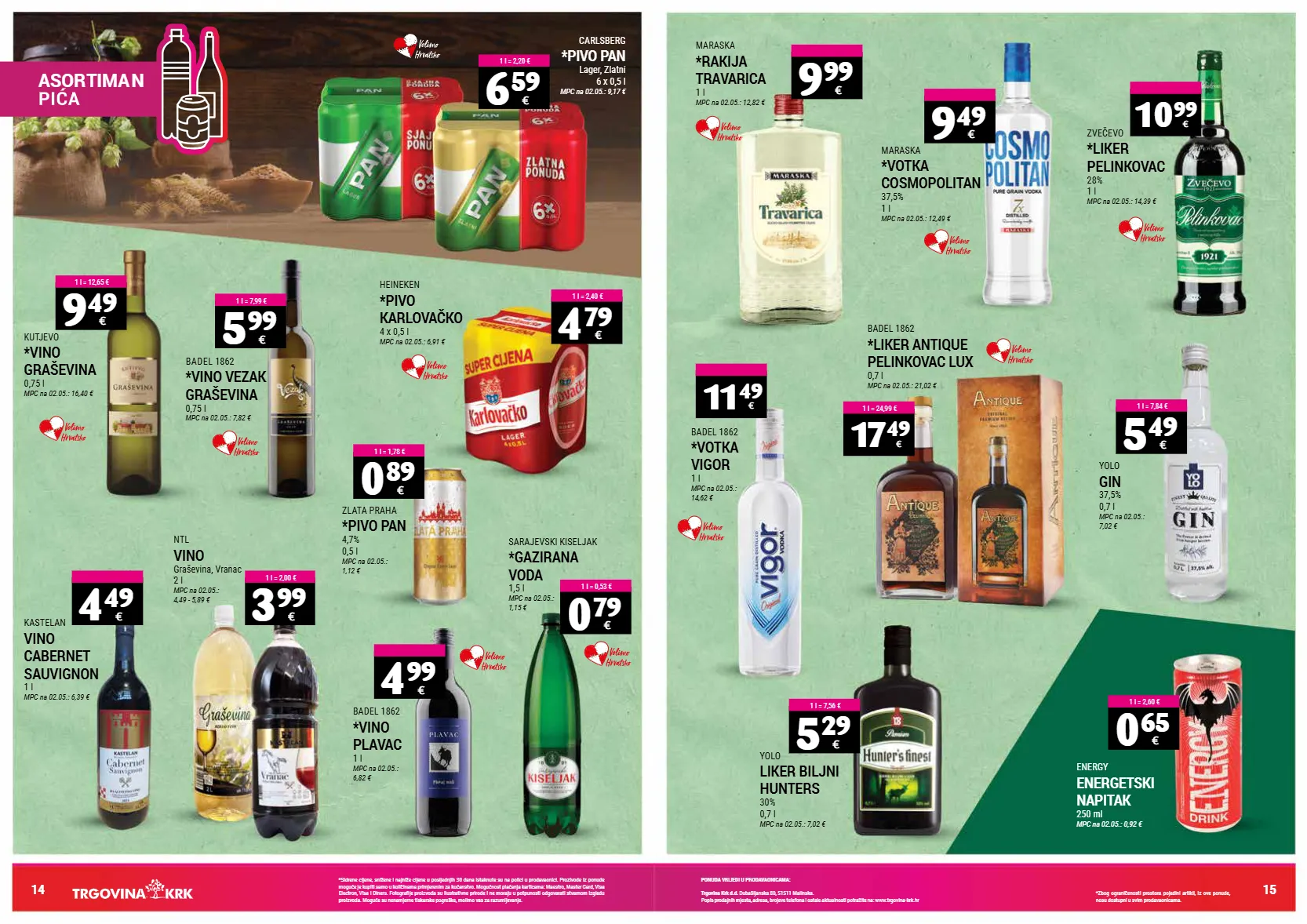 *sidrene cijene, snižene i najniže cijene u posljednjih 30 dana istaknute su na polici u prodavaonici. prozivode iz ponude moguće je kupiti samo u količinama primjerenim za kućanstvo. mogućnost plaćanja karticama: maestro, master card, visa electron, visa i diners. fotografije proizvoda su ilustrativne prirode i ne moraju u potpunosti odgovarati stvarnom izgledu proizvoda. moguće su nenamjerne tiskarske pogreške, molimo vas za razumijevanje. ponuda vrijedi u prodavaonicama: trgovina krk d.d. dubašljanska 80, 51511 malinska. popis prodajnih mjesta, adresa, brojeve telefona i ostale aktualnosti potražite na: www.trgovina-krk.hr *zbog ograničenosti prostora pojedini artikli, iz ove ponude, nosu dostupni u svim prodavaonicama. 15 14 asor tima n 6 59 € 1 l = 2,20 € 0 89 € 1 l = 1,78 € 4 79 € 1 l = 2,40 € 4 99 € 4 49 € 3 99 € 1 l = 2,00 € 5 99 € 1 l = 7,99 € 9 49 € 1 l = 12,65 € carlsberg *pivo pan lager, zlatni 6 x 0,5 l mpc na 02.05.: 9,17 € zlata praha *pivo pan 4,7% 0,5 l mpc na 02.05.: 1,12 € heineken *pivo karlovačko 4 x 0,5 l mpc na 02.05.: 6,91 € badel 1862 *vino plavac 1 l mpc na 02.05.: 6,82 € kastelan vino cabernet sauvignon 1 l mpc na 02.05.: 6,39 € kutjevo *vino graševina 0,75 l mpc na 02.05.: 16,40 € ntl vino graševina, vranac 2 l mpc na 02.05.: 4,49 - 5,89 € badel 1862 *vino vezak graševina 0,75 l mpc na 02.05.: 7,82 € 0 65 € 1 l = 2,60 € energy energetski napitak 250 ml mpc na 02.05.: 0,92 € 5 49 € 1 l = 7,84 € 5 29 € 1 l = 7,56 € 9 99 € 9 49 € yolo gin 37,5% 0,7 l mpc na 02.05.: 7,02 € yolo liker biljni hunters 30% 0,7 l mpc na 02.05.: 7,02 € badel 1862 *liker antique pelinkovac lux 0,7 l mpc na 02.05.: 21,02 € badel 1862 *votka vigor 1 l mpc na 02.05.: 14,62 € maraska *rakija travarica 1 l mpc na 02.05.: 12,82 € maraska *votka cosmopolitan 37,5% 1 l mpc na 02.05.: 12,49 € zvečevo *liker pelinkovac 28% 1 l mpc na 02.05.: 14,39 € 17 49 € 1 l = 24,99 € 11 49 € 10 99 € 0 79 € 1 l = 0,53 € sarajevski kiseljak *gazirana voda 1,5 l mpc na 02.05.: 1,15 €