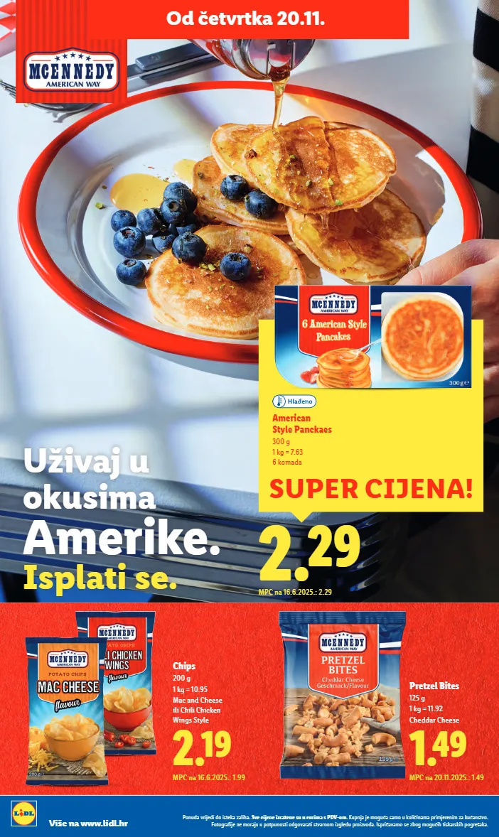 Uživaj u okusima Isplati se. Amerike. 2.29 MPC na 16.6.2025.: 2.29 SUPER CIJENA! American Style Panckaes 300 g 1 kg = 7.63 6 komada 2.19 MPC na 16.6.2025.: 1.99 Chips 200 g 1 kg = 10.95 Mac and Cheese ili Chili Chicken Wings Style 1.49 MPC na 20.11.2025.: 1.49 Pretzel Bites 125 g 1 kg = 11.92 Cheddar Cheese Ponuda vrijedi do isteka zaliha. Sve cijene izražene su u eurima s PDV-om. Kupnja je moguća samo u količinama primjerenim za kućanstvo. Fotografije ne moraju u potpunosti odgovarati stvarnom izgledu proizvoda. Ispričavamo se zbog mogućih tiskarskih pogrešaka. Više na www.lidl.hr Od četvrtka 20.11.