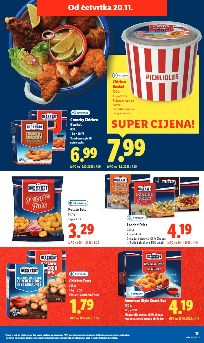 4.19 mpc na 20.11.2025.: 4.19 loaded fries 280 g 1 kg = 14.96 cheddar i slanina, chili cheese ili pulled chicken i bbq umak 7.99 mpc na 16.6.2025.: 7.99 super cijena! chicken bucket 750 g 1 kg = 10.65 pržena piletina u kantici sa slatko kiselim i curry umakom 4.19 mpc na 13.10.2025.: 4.19 american style snack box 450 g 1 kg = 9.31 mozzarella sticks, chilli cheese nuggets, onion rings i chilli dip 3.29 mpc na 20.11.2025.: 3.29 potato tots 907 g 1 kg = 3.63 1.79 mpc na 16.6.2025.: 1.59 chicken pops 210 g 1 kg = 8.52 classic i southern fried 6.99 mpc na 13.10.2025.: 7.49 crunchy chicken bucket 650 g 1 kg = 10.75 southern style ili spicy style 11 nac 47/2025 ponuda vrijedi do isteka zaliha. sve cijene izražene su u eurima s pdv-om. kupnja je moguća samo u količinama primjerenim za kućanstvo. fotografije ne moraju u potpunosti odgovarati stvarnom izgledu proizvoda. ispričavamo se zbog mogućih tiskarskih pogrešaka. od četvrtka 20.11.