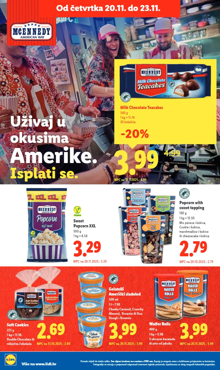 3.99 4.99 milk chocolate teacakes 340 g 1 kg = 11.74 20 kolačića mpc na 12.5.2025.: 4.99 -20% 2.69 mpc na 13.10.2025.: 2.69 soft cookies 225 g 1 kg = 11.96 double chocolate ili mliječna čokolada 3.99 mpc na 20.11.2025.: 3.99 walfer rolls 400 g 1 kg = 9.98 s okusom karamele ili pite od jabuka 2.79 mpc na 20.10.2025.: 2.79 popcorn with sweet topping 180 g 1 kg = 15.50 mix pereca i kokica, cookie i kokice, marshmallow i kokice ili cheesecake i kokice 3.29 mpc na 20.11.2025.: 3.29 sweet popcorn xxl 500 g 1 kg = 6.58 3.99 mpc na 20.11.2025.: 3.99 gelatelli američki sladoled 500 ml 1 l = 7.98 cheeky caramel, crunchy almond, brownie ili duo dough i brownie uživaj u okusima isplati se. amerike. ponuda vrijedi do isteka zaliha. sve cijene izražene su u eurima s pdv-om. kupnja je moguća samo u količinama primjerenim za kućanstvo. fotografije ne moraju u potpunosti odgovarati stvarnom izgledu proizvoda. ispričavamo se zbog mogućih tiskarskih pogrešaka. više na www.lidl.hr od četvrtka 20.11. do 23.11.