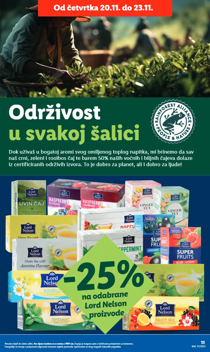 -25% na odabrane Lord Nelson proizvode Održivost u svakoj šalici Dok uživaš u bogatoj aromi svog omiljenog toplog napitka, mi brinemo da sav naš crni, zeleni i rooibos čaj te barem 50% naših voćnih i biljnih čajeva dolaze iz certificiranih održivih izvora. To je dobro za planet, ali i dobro za ljude! 13 NAC 47/2025 Ponuda vrijedi do isteka zaliha. Sve cijene izražene su u eurima s PDV-om. Kupnja je moguća samo u količinama primjerenim za kućanstvo. Fotografije ne moraju u potpunosti odgovarati stvarnom izgledu proizvoda. Ispričavamo se zbog mogućih tiskarskih pogrešaka. Od četvrtka 20.11. do 23.11.