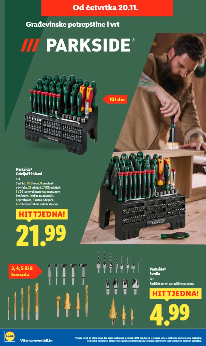Građevinske potrepštine i vrt Parkside ® Odvijači i bitovi Set Sadržaj: 60 bitova, 8 preciznih odvijača, 21 odvijač, 2 VDE odvijači, 1 VDE ispitivač napona s metalnom kvačicom, 1 ručka za odvijač s čegrtaljkom, 2 kutna odvijača, 6 šesterokutnih nasadnih ključva 21.99 HIT TJEDNA! Parkside ® Svrdla Set Različiti setovi za različite namjene 4.99 HIT TJEDNA! Od četvrtka 20.11. 101 dio 3, 4, 5 ili 8 komada Ponuda vrijedi do isteka zaliha. Sve cijene izražene su u eurima s PDV-om. Kupnja je moguća samo u količinama primjerenim za kućanstvo. Fotografije ne moraju u potpunosti odgovarati stvarnom izgledu proizvoda. Ispričavamo se zbog mogućih tiskarskih pogrešaka. Više na www.lidl.hr