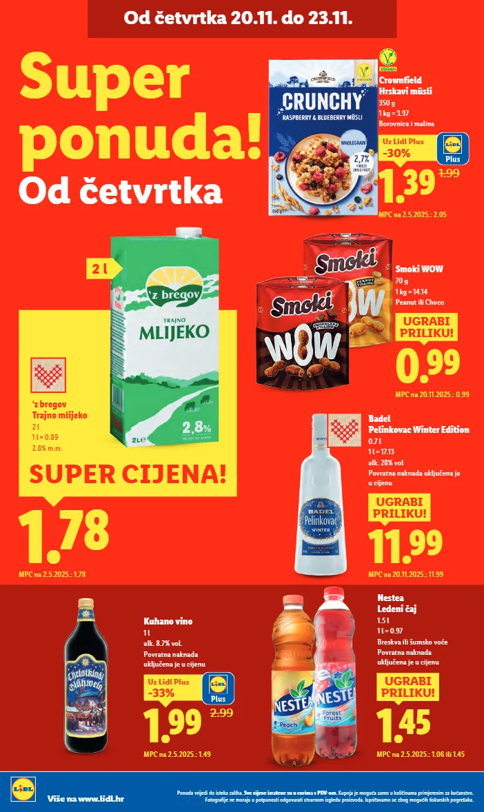 super ponuda! od četvrtka 1.78 mpc na 2.5.2025.: 1.78 super cijena! ‘z bregov trajno mlijeko 2 l 1 l = 0.89 2.8% m.m. 2.99 1.99 -33% uz lidl plus mpc na 2.5.2025.: 1.49 kuhano vino 1 l alk. 8.7% vol. povratna naknada uključena je u cijenu 0.99 ugrabi priliku! mpc na 20.11.2025.: 0.99 smoki wow 70 g 1 kg = 14.14 peanut ili choco 11.99 ugrabi priliku! mpc na 20.11.2025.: 11.99 badel pelinkovac winter edition 0.7 l 1 l = 17.13 alk. 28% vol povratna naknada uključena je u cijenu crownfield hrskavi müsli 350 g 1 kg = 3.97 borovnica i malina 1.99 1.39 -30% uz lidl plus mpc na 2.5.2025.: 2.05 1.45 ugrabi priliku! mpc na 2.5.2025.: 1.06 ili 1.45 nestea ledeni čaj 1.5 l 1 l = 0.97 breskva ili šumsko voće povratna naknada uključena je u cijenu 2 l od četvrtka 20.11. do 23.11. ponuda vrijedi do isteka zaliha. sve cijene izražene su u eurima s pdv-om. kupnja je moguća samo u količinama primjerenim za kućanstvo. fotografije ne moraju u potpunosti odgovarati stvarnom izgledu proizvoda. ispričavamo se zbog mogućih tiskarskih pogrešaka. više na www.lidl.hr