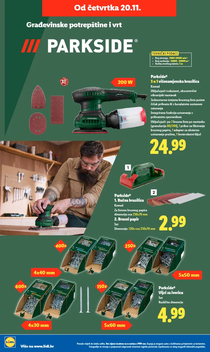 24.99 parkside® 3 u 1 višenamjenska brusilica komad uključujući trokutasti, ekscentrični vibracijski nastavak jednostavna izmjena brusnog lista putem čičak prihvata ili s bezalatnim sustavom zatezanja integrirana funkcija usisavanja s prihvatnim spremnikom uključujući: po 2 brusna lista po nastavku (granulacije 80/240 ), 1 pribor za fiksiranje brusnog papira, 1 adapter za eksterno usisavanje prašine, 1 šesterokutni ključ tehnički podaci • broj okretaja: 7000-12000 min - ¹ • broj oscilacija: 14000 - 24000 m - ¹ • dužina mrežnog kabela: 3 m 4x30 mm 5x60 mm 4x40 mm 5x50 mm 200 w 4.99 parkside® vijci za ivericu set različite dimenzije 600x 400x 150x 250x građevinske potrepštine i vrt od četvrtka 20.11. 1 2.99 parkside® 1. ručna brusilica komad za listove brusnog papira dimenzija cca 230x70 mm 2. brusni papir set dimenzije: 120x cca 230x70 mm 2 ponuda vrijedi do isteka zaliha. sve cijene izražene su u eurima s pdv-om. kupnja je moguća samo u količinama primjerenim za kućanstvo. fotografije ne moraju u potpunosti odgovarati stvarnom izgledu proizvoda. ispričavamo se zbog mogućih tiskarskih pogrešaka. više na www.lidl.hr