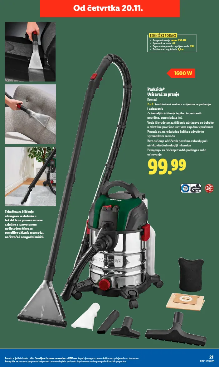 TEHNIČKI PODACI • Snaga usisavanja: maks. 250 AW • Spremnik za vodu: 4 L • Zapremnina posude za prljavu vodu: 20 L • Dužina mrežnog kabela: 7,5 m 99.99 Parkside® Usisavač za pranje Komad 2 u 1: kombinirani sustav s crijevom za prskanje i usisavanje Za temeljito čišćenje tepiha, tapeciranih površina, auto sjedala i sl. Voda ili sredstvo za čišćenje ubrizgava se duboko u tekstilne površine i usisava zajedno s prašinom Posuda od nehrđajućeg čelika s odvojivim spremnikom za vodu Brzo sušenje očišćenih površina zahvaljujući učinkovitoj tehnologiji mlaznica Primjenjiv za čišćenje tvrdih podloga i suho usisavanje Tekućina za čišćenje ubrizgava se duboko u tekstil te se ponovo isisava zajedno s rastvorenom nečistoćom čime se temeljito uklanja masnoća, nečistoća i neugodni mirisi. Od četvrtka 20.11. 1600 W 21 NAC 47/2025 Ponuda vrijedi do isteka zaliha. Sve cijene izražene su u eurima s PDV-om. Kupnja je moguća samo u količinama primjerenim za kućanstvo. Fotografije ne moraju u potpunosti odgovarati stvarnom izgledu proizvoda. Ispričavamo se zbog mogućih tiskarskih pogrešaka.