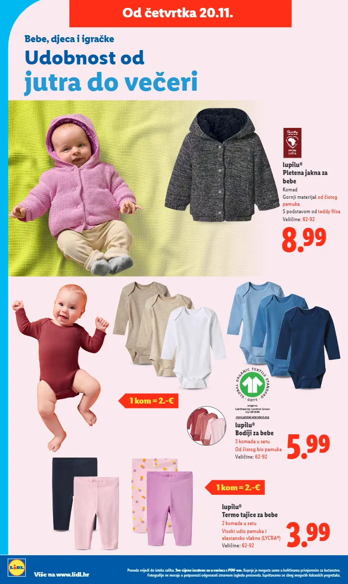 bebe, djeca i igračke udobnost od jutra do večeri od četvrtka 20.11. 3.99 lupilu® termo tajice za bebe 2 komada u setu visoki udio pamuka i elastansko vlakno (lycra®) veličine: 62-92 8.99 lupilu® pletena jakna za bebe komad gornji materijal od čistog pamuka s podstavom od teddy flisa veličine: 62-92 1 kom = 2.-€ organic certified by control union cu 851646 www.global-standard.org 5.99 lupilu® bodiji za bebe 3 komada u setu od čistog bio pamuka veličine: 62-92 1 kom = 2.-€ ponuda vrijedi do isteka zaliha. sve cijene izražene su u eurima s pdv-om. kupnja je moguća samo u količinama primjerenim za kućanstvo. fotografije ne moraju u potpunosti odgovarati stvarnom izgledu proizvoda. ispričavamo se zbog mogućih tiskarskih pogrešaka. više na www.lidl.hr