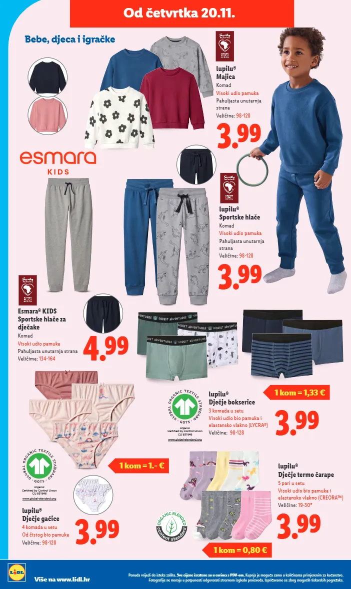 bebe, djeca i igračke od četvrtka 20.11. 3.99 lupilu® dječje bokserice 3 komada u setu visoki udio bio pamuka i elastansko vlakno (lycra®) veličine: 98-128 3.99 lupilu® dječje gaćice 4 komada u setu od čistog bio pamuka veličine: 98-128 4.99 esmara® kids sportske hlače za dječake komad visoki udio pamuka pahuljasta unutarnja strana veličime: 134-164 3.99 lupilu® sportske hlače komad visoki udio pamuka pahuljasta unutarnja strana veličine: 98-128 3.99 lupilu® dječje termo čarape 5 pari u setu visoki udio bio pamuka i elastansko vlakno (creora™) veličine: 19-30* 1 kom = 1,33 € 1 kom = 1.- € organic certified by control union cu 851646 www.global-standard.org organic certified by control union cu 851646 www.global-standard.org 3.99 lupilu® majica komad visoki udio pamuka pahuljasta unutarnja strana veličine: 98-128 1 kom = 0,80 € ponuda vrijedi do isteka zaliha. sve cijene izražene su u eurima s pdv-om. kupnja je moguća samo u količinama primjerenim za kućanstvo. fotografije ne moraju u potpunosti odgovarati stvarnom izgledu proizvoda. ispričavamo se zbog mogućih tiskarskih pogrešaka. više na www.lidl.hr