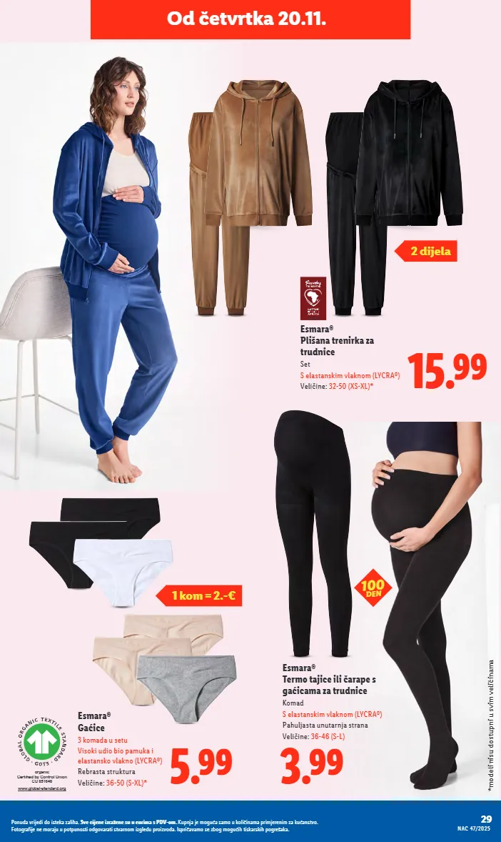 od četvrtka 20.11. 5.99 esmara® gaćice 3 komada u setu visoki udio bio pamuka i elastansko vlakno (lycra®) rebrasta struktura veličine: 36-50 (s-xl)* 15.99 esmara® plišana trenirka za trudnice set s elastanskim vlaknom (lycra®) veličine: 32-50 (xs-xl)* 1 kom = 2.-€ 2 dijela organic certified by control union cu 851646 www.global-standard.org 3.99 esmara® termo tajice ili čarape s gaćicama za trudnice komad s elastanskim vlaknom (lycra®) pahuljasta unutarnja strana veličine: 36-46 (s-l) *modeli nisu dostupni u svim veličinama 100 den 29 nac 47/2025 ponuda vrijedi do isteka zaliha. sve cijene izražene su u eurima s pdv-om. kupnja je moguća samo u količinama primjerenim za kućanstvo. fotografije ne moraju u potpunosti odgovarati stvarnom izgledu proizvoda. ispričavamo se zbog mogućih tiskarskih pogrešaka.