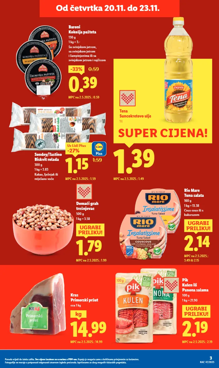 rio mare tuna salata 160 g 1 kg = 13.38 cous cous ili s kukuruzom 2.14 ugrabi priliku! mpc na 2.5.2025.: 3.49 ili 2.15 2.19 ugrabi priliku! mpc na 2.5.2025.: 2.19 pik kulen ili panona salama 100 g 1 kg = 21.90 1.79 ugrabi priliku! mpc na 2.5.2025.: 1.99 domaći grah trešnjevac 500 g 1 kg = 3.58 sondey/tastino biskvit rolada 300 g 1 kg = 3.83 kakao, lješnjak ili miješano voće 1.39 mpc na 2.5.2025.: 1.49 super cijena! tena suncokretovo ulje 1 l 1.59 1.15 -27% uz lidl plus mpc na 2.5.2025.: 1.59 kras primorski pršut cca 1 kg 0.39 -33% 0.59 mpc na 2.5.2025.: 0.59 baroni kokošja pašteta 130 g 1 kg = 3.- sa svinjskom jetrom, sa svinjskom jetrom i šampinjonima ili sa svinjskom jetrom i rajčicom 14.99 kg mpc na 2.5.2025.: 14.99 od četvrtka 20.11. do 23.11. 3 nac 47/2025 ponuda vrijedi do isteka zaliha. sve cijene izražene su u eurima s pdv-om. kupnja je moguća samo u količinama primjerenim za kućanstvo. fotografije ne moraju u potpunosti odgovarati stvarnom izgledu proizvoda. ispričavamo se zbog mogućih tiskarskih pogrešaka.