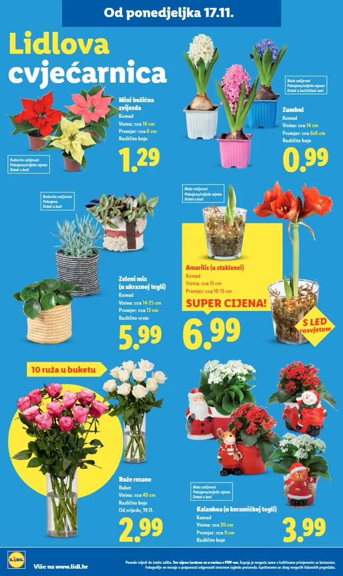 2.99 Ruže rezane Buket Visina: cca 40 cm Različite boje Od srijede, 19.11. Od ponedjeljka 17.11. 10 ruža u buketu Malo zalijevati Polusjena/svijetlo mjesto Držati u kući/držati vani Malo zalijevati Polusjena/svijetlo mjesto Držati u kući Redovito zalijevati Polusjena Držati u kući 3.99 Kalanhoa (u keramičkoj tegli) Komad Visina: cca 20 cm Promjer: cca 9 cm Različite boje 5.99 Zeleni mix (u ukrasnoj tegli) Komad Visina: cca 14-25 cm Promjer: cca 12 cm Različite vrste Lidlova cvjećarnica Ponuda vrijedi do isteka zaliha. Sve cijene izražene su u eurima s PDV-om. Kupnja je moguća samo u količinama primjerenim za kućanstvo. Fotografije ne moraju u potpunosti odgovarati stvarnom izgledu proizvoda. Ispričavamo se zbog mogućih tiskarskih pogrešaka. Više na www.lidl.hr 6.99 SUPER CIJENA! Amarilis (u staklenci) Komad Visina: cca 15 cm Promjer: cca 10-15 cm 1.29 Mini božićna zvijezda Komad Visina: cca 16 cm Promjer: cca 6 cm Različite boje Redovito zalijevati Polusjena/svijetlo mjesto Držati u kući 0.99 Zumbul Komad Visina: cca 14 cm Promjer: cca 6x6 cm Različite boje Malo zalijevati Polusjena/svijetlo mjesto Držati u kući S LED rasvjetom