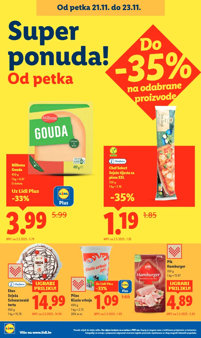 do -35% na odabrane proizvode super ponuda! od petka 1.19 1.85 chef select svježe tijesto za pizzu xxl 550 g 1 kg = 2.16 mpc na 2.5.2025.: 1.85 -35% 14.99 ugrabi priliku! mpc na 2.5.2025.: 14.99 ekos svježa schwarzwald torta 950 g 1 kg = 15.78 uz lidl plus -33% 3.99 5.99 milbona gouda 450 g 1 kg = 8.87 iz koluta mpc na 2.5.2025.: 5.79 4.89 ugrabi priliku! mpc na 2.5.2025.: 3.99 pik hamburger 350 g 1 kg = 13.97 1.65 1.09 -33% uz lidl plus mpc na 2.5.2025.: 1.65 pilos kiselo vrhnje 400 g 1 kg = 2.73 20% m.m. ponuda vrijedi do isteka zaliha. sve cijene izražene su u eurima s pdv-om. kupnja je moguća samo u količinama primjerenim za kućanstvo. fotografije ne moraju u potpunosti odgovarati stvarnom izgledu proizvoda. ispričavamo se zbog mogućih tiskarskih pogrešaka. više na www.lidl.hr od petka 21.11. do 23.11.