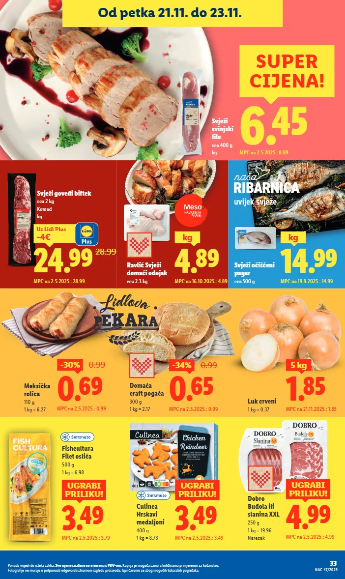 svježi svinjski file cca 400 g kg 14.99 kg mpc na 19.9.2025.: 14.99 svježi očišćeni pagar cca 500 g svježi goveđi biftek cca 2 kg komad kg 28.99 24.99 -4€ uz lidl plus mpc na 2.5.2025.: 28.99 domaća craft pogača 300 g 1 kg = 2.17 6.45 mpc na 2.5.2025.: 8.89 super cijena! 0.69 -30% 0.99 mpc na 2.5.2025.: 0.99 meksička rolica 110 g 1 kg = 6.27 0.65 -34% 0.99 mpc na 2.5.2025.: 0.99 3.49 ugrabi priliku! mpc na 2.5.2025.: 3.79 fishcultura filet oslića 500 g 1 kg = 6.98 3.49 ugrabi priliku! mpc na 2.5.2025.: 3.49 culinea hrskavi medaljoni 400 g 1 kg = 8.73 4.89 kg mpc na 16.10.2025.: 4.89 ravlić svježi domaći odojak cca 2.3 kg 1.85 5 kg mpc na 21.11.2025.: 1.85 luk crveni 1 kg = 0.37 4.99 ugrabi priliku! mpc na 2.5.2025.: 4.99 dobro buđola ili slanina xxl 250 g 1 kg = 19.96 narezak 33 nac 47/2025 ponuda vrijedi do isteka zaliha. sve cijene izražene su u eurima s pdv-om. kupnja je moguća samo u količinama primjerenim za kućanstvo. fotografije ne moraju u potpunosti odgovarati stvarnom izgledu proizvoda. ispričavamo se zbog mogućih tiskarskih pogrešaka. od petka 21.11. do 23.11.