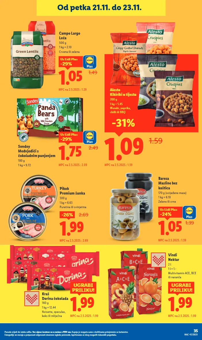 1.09 1.59 alesto kikiriki u tijestu 200 g 1 kg = 5.45 wasabi, paprika, chilli ili bbq mpc na 2.5.2025.: 1.59 -31% 2.49 1.75 -29% uz lidl plus mpc na 2.5.2025.: 2.89 sondey medvjedići s čokoladnim punjenjem 180 g 1 kg = 9.72 1.49 1.05 -29% uz lidl plus mpc na 2.5.2025.: 1.29 campo largo leća 500 g 1 kg = 2.10 crvena ili zelena 1.99 -26% 2.69 mpc na 2.5.2025.: 2.69 pikok premium šunka 300 g 1 kg = 6.63 puretina ili svinjetina 1.39 1.05 -24% uz lidl plus mpc na 2.5.2025.: 1.39 baresa masline bez koštica 170 g (ocijeđene mase) 1 kg = 6.18 zelene ili crne 1.99 ugrabi priliku! mpc na 2.5.2025.: 1.99 vindi nektar 2 l 1 l = 1.- multivitamin ace, bce ili naranča 1.99 ugrabi priliku! mpc na 2.5.2025.: 1.99 kraš dorina čokolada 160 g 1 kg = 12.44 noisette, speculas, keks ili mliječna od petka 21.11. do 23.11. 35 nac 47/2025 ponuda vrijedi do isteka zaliha. sve cijene izražene su u eurima s pdv-om. kupnja je moguća samo u količinama primjerenim za kućanstvo. fotografije ne moraju u potpunosti odgovarati stvarnom izgledu proizvoda. ispričavamo se zbog mogućih tiskarskih pogrešaka.