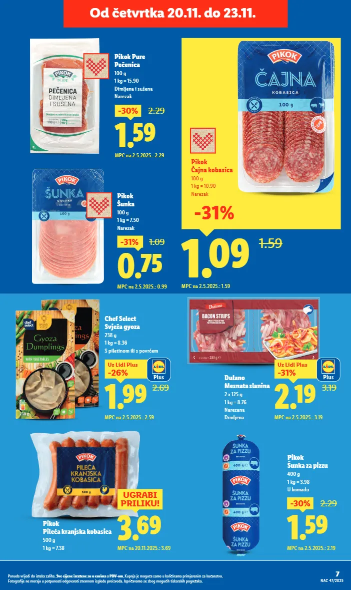 chef select svježa gyoza 238 g 1 kg = 8.36 s piletinom ili s povrćem 2.69 1.99 -26% uz lidl plus mpc na 2.5.2025.: 2.59 dulano mesnata slanina 2 x 125 g 1 kg = 8.76 narezana dimljena 3.19 2.19 -31% uz lidl plus mpc na 2.5.2025.: 3.19 1.09 1.59 pikok čajna kobasica 100 g 1 kg = 10.90 narezak mpc na 2.5.2025.: 1.59 -31% pikok šunka 100 g 1 kg = 7.50 narezak 0.75 -31% 1.09 mpc na 2.5.2025.: 0.99 1.59 -30% 2.29 mpc na 2.5.2025.: 2.29 pikok pure pečenica 100 g 1 kg = 15.90 dimljena i sušena narezak 1.59 -30% 2.29 mpc na 2.5.2025.: 2.19 pikok šunka za pizzu 400 g 1 kg = 3.98 u komadu 3.69 ugrabi priliku! mpc na 20.11.2025.: 3.69 pikok pileća kranjska kobasica 500 g 1 kg = 7.38 7 nac 47/2025 ponuda vrijedi do isteka zaliha. sve cijene izražene su u eurima s pdv-om. kupnja je moguća samo u količinama primjerenim za kućanstvo. fotografije ne moraju u potpunosti odgovarati stvarnom izgledu proizvoda. ispričavamo se zbog mogućih tiskarskih pogrešaka. od četvrtka 20.11. do 23.11.