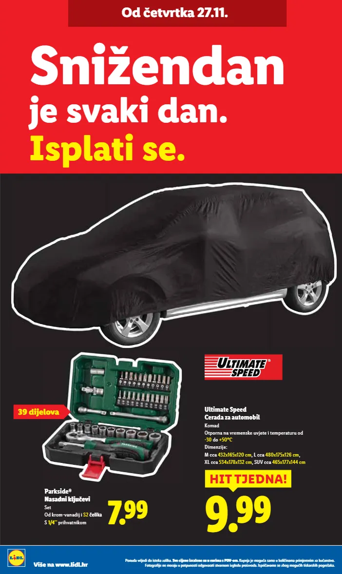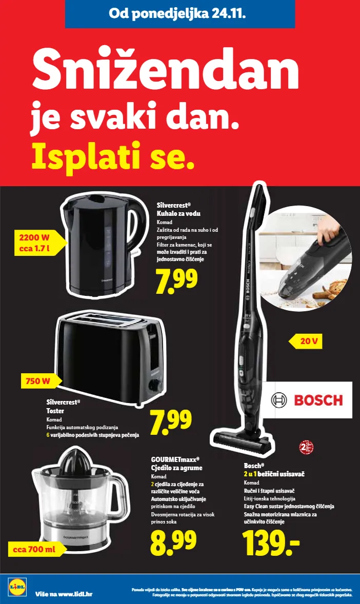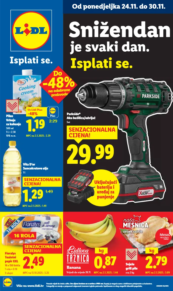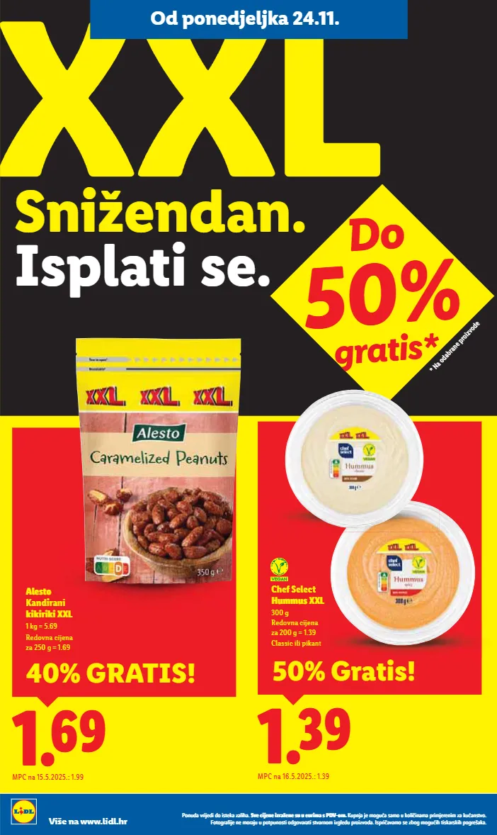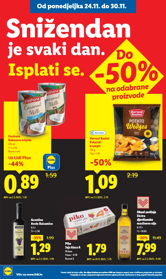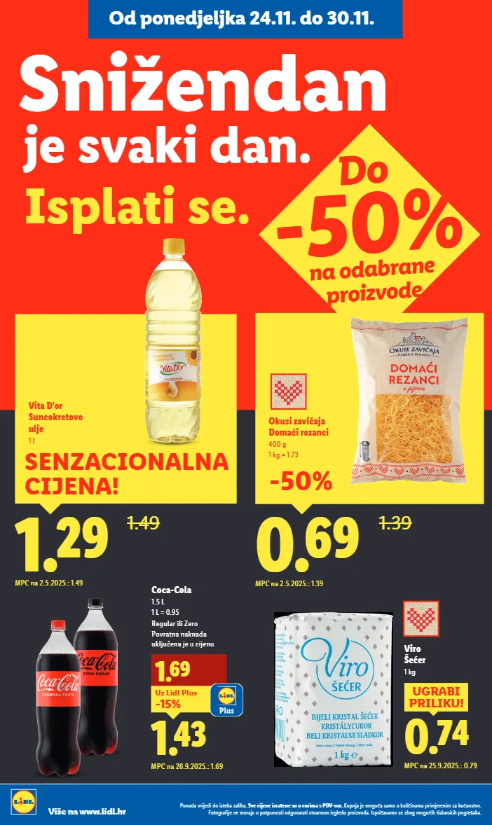 od ponedjeljka 24.11. do 30.11. viro šećer 1 kg 0.74 ugrabi priliku! mpc na 25.9.2025.: 0.79 1.43 1.69 mpc na 26.9.2025.: 1.69 coca-cola 1.5 l 1 l = 0.95 regular ili zero povratna naknada uključena je u cijenu -15% uz lidl plus ponuda vrijedi do isteka zaliha. sve cijene izražene su u eurima s pdv-om. kupnja je moguća samo u količinama primjerenim za kućanstvo. fotografije ne moraju u potpunosti odgovarati stvarnom izgledu proizvoda. ispričavamo se zbog mogućih tiskarskih pogrešaka. više na www.lidl.hr je svaki dan. isplati se. snižendan 0.69 1.39 okusi zavičaja domaći rezanci 400 g 1 kg = 1.73 mpc na 2.5.2025.: 1.39 -50% 1.49 do -50% na odabrane proizvode 1.29 mpc na 2.5.2025.: 1.49 senzacionalna cijena! vita d'or suncokretovo ulje 1 l 1.49