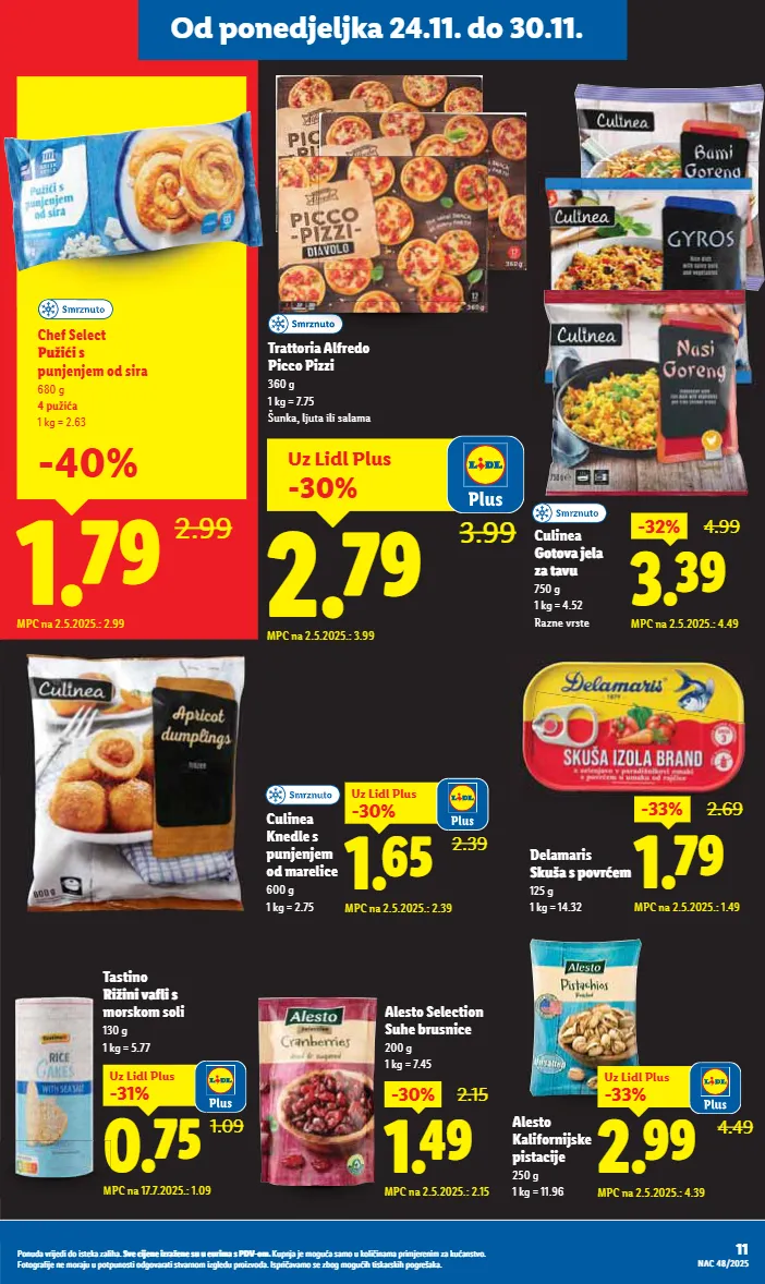 `iÉÎ -30% 2.15 MPC na 2.5.2025.: 2.15 Alesto Selection Suhe brusnice 200 g 1 kg = 7.45 1.09 _iÌÊ -31% Uz Lidl Plus MPC na 17.7.2025.: 1.09 Tastino YÀęÀÙÀĊ·Àó morskom soli 130 g 1 kg = 5.77 Od ponedjeljka 24.11. do 30.11. 4.49 aiÎÎ -33% Uz Lidl Plus MPC na 2.5.2025.: 4.39 Alesto Kalifornijske pistacije 250 g 1 kg = 11.96 M Trattoria Alfredo Picco Pizzi 360 g 1 kg = 7.75 Šunka, ljuta ili salama biÈÎ -32% 4.99 MPC na 2.5.2025.: 4.49 Culinea &àúàĊÌ¨Ò ėúĊÿ 750 g 1 kg = 4.52 Razne vrste 11 ǭàȕȡǼDzĊȝǿȋ¨ǼǿǼàǿóú¨ÏDzėDzȎǿ½Dzı ]Ċ¨ǿȋ¨ȕ¨ǿėȝDzę¨ȕ¨óȡȡ¨ȡȝǿȔDzóǭǞtƖàȔı ;ȡȜȕȋDzȋ¨Ȕà¸ȡDzóDzȔàȡÏàȎǿ ǿȕDzȔDzȜȝǿȔȋ¨ȝ¨ȕǿȔėDzÏȡDzȕóúĊàı %àúà¸ȝDz³ǿȋ¨ȕ¨ȔàȝDzȋȡȡȜàúȜȡȕàóúǿàǼ¸àĊDzȝDzúǿóúĊDzȝȕàȔǿė¸Ȏ¨ǼȡȜȝàǿėĊàǼDzıǢóȜȝǿ DzĊDzȔàó¨ėà¸Ȕà¸ȡǿ½úǿóÏDzȝóÏǿ½Ȝà¸ȝ¨õDzÏDzı DƟƣĮƝƛƝƠ 2.39 `iËÊ -30% Uz Lidl Plus MPC na 2.5.2025.: 2.39 Culinea Knedle s punjenjem od marelice 600 g 1 kg = 2.75 `iÌÎ 2.99 Chef Select VÿęÀÀó punjenjem od sira 680 g ƐìÿęÀ 1 kg = 2.63 MPC na 2.5.2025.: 2.99 -40% `iÌÎ -33% 2.69 MPC na 2.5.2025.: 1.49 Delamaris ]ÏÿõóìàĊï¨Ø 125 g 1 kg = 14.32 Uz Lidl Plus -30% aiÌÎ 3.99 MPC na 2.5.2025.: 3.99