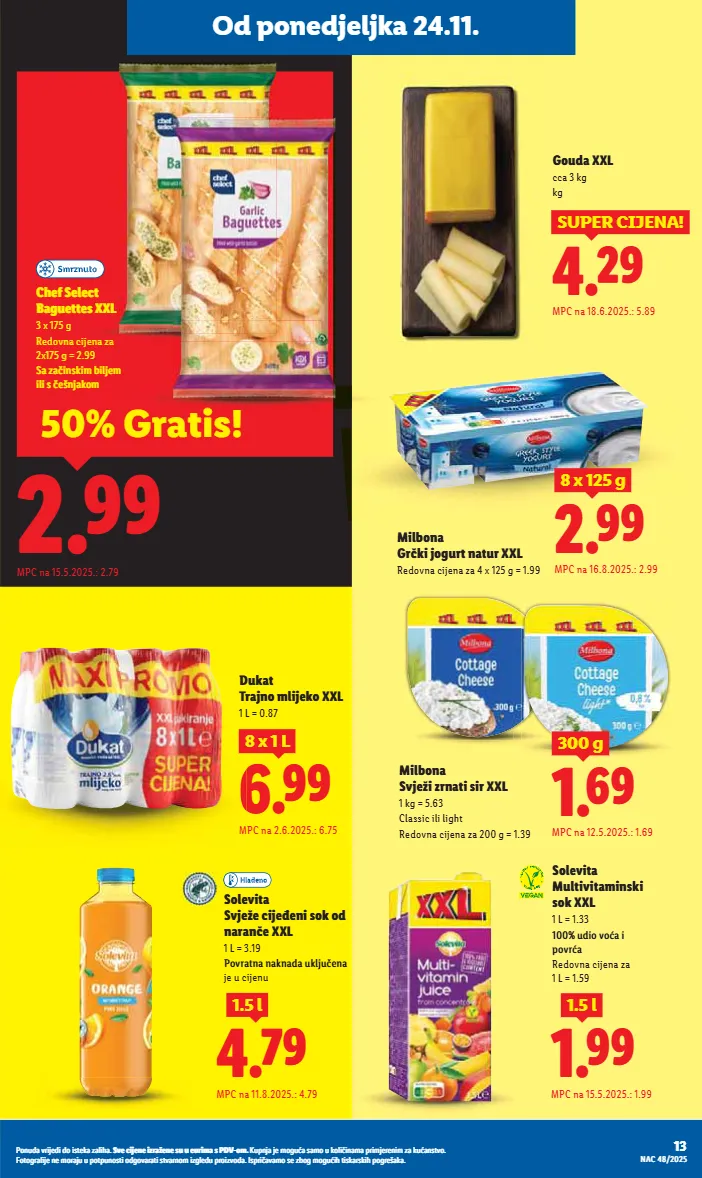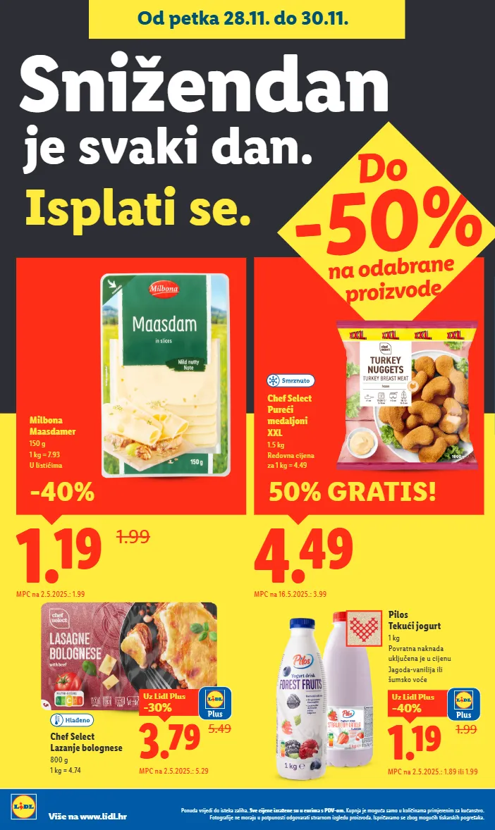 ponuda vrijedi do isteka zaliha. sve cijene izražene su u eurima s pdv-om. kupnja je moguća samo u količinama primjerenim za kućanstvo. fotografije ne moraju u potpunosti odgovarati stvarnom izgledu proizvoda. ispričavamo se zbog mogućih tiskarskih pogrešaka. više na www.lidl.hr 1.19 1.99 milbona maasdamer 150 g 1 kg = 7.93 u listićima mpc na 2.5.2025.: 1.99 -40% 4.49 chef select pureći medaljoni xxl 1.5 kg redovna cijena za 1 kg = 4.49 mpc na 16.5.2025.: 3.99 50% gratis! pilos tekući jogurt 1 kg povratna naknada uključena je u cijenu jagoda-vanilija ili šumsko voće 1.99 1.19 -40% uz lidl plus mpc na 2.5.2025.: 1.89 ili 1.99 je svaki dan. isplati se. snižendan od petka 28.11. do 30.11. chef select lazanje bolognese 800 g 1 kg = 4.74 do -50% na odabrane proizvode 5.49 3.79 -30% uz lidl plus mpc na 2.5.2025.: 5.29