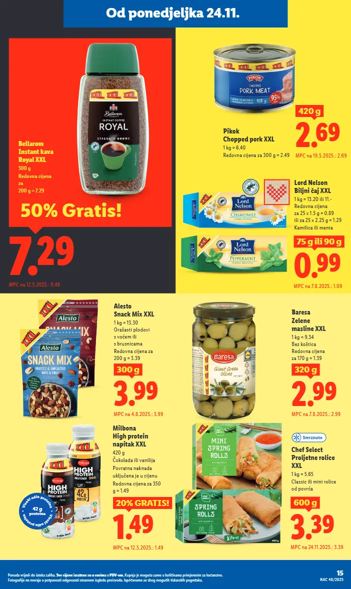 15 ponuda vrijedi do isteka zaliha. sve cijene izražene su u eurima s pdv-om. kupnja je moguća samo u količinama primjerenim za kućanstvo. fotografije ne moraju u potpunosti odgovarati stvarnom izgledu proizvoda. ispričavamo se zbog mogućih tiskarskih pogrešaka. nac 48/2025 od ponedjeljka 24.11. 1.49 20% gratis! mpc na 12.5.2025.: 1.49 milbona high protein napitak xxl 420 g čokolada ili vanilija povratna naknada uključena je u cijenu redovna cijena za 350 g = 1.49 3.99 300 g mpc na 4.8.2025.: 3.99 alesto snack mix xxl 1 kg = 13.30 orašasti plodovi s voćem ili s brusnicama redovna cijena za 200 g = 3.39 pikok chopped pork xxl 1 kg = 6.40 redovna cijena za 300 g = 2.49 2.69 420 g mpc na 19.5.2025.: 2.69 2.99 320 g mpc na 7.8.2025.: 2.99 baresa zelene masline xxl 1 kg = 9.34 bez koštica redovna cijena za 170 g = 1.39 0.99 75 g ili 90 g mpc na 7.8.2025.: 1.09 lord nelson biljni čaj xxl 1 kg = 13.20 ili 11.- redovna cijena za 25 x 1.5 g = 0.89 ili za 25 x 2.25 g = 1.29 kamilica ili menta v i s o k i u d i o p r o t e i n a v i s o k i u d i o p r o t e i n a 42 g proteina 3.39 600 g mpc na 24.11.2025.: 3.39 chef select proljetne rolice xxl 1 kg = 5.65 classic ili mini rolice od povrća 7.29 bellarom instant kava royal xxl 300 g redovna cijena za 200 g = 7.29 mpc na 12.5.2025.: 8.49 50% gratis!