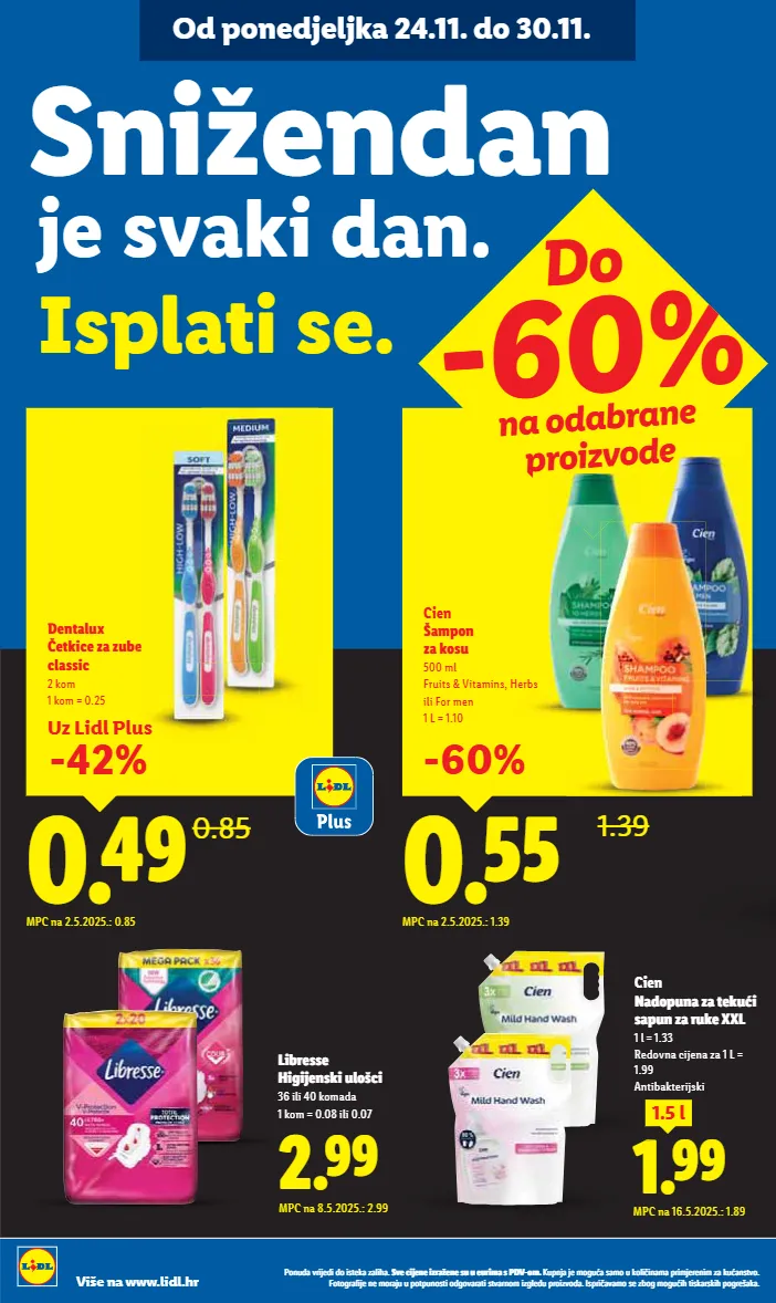 ǭàȕȡǼDzĊȝǿȋ¨ǼǿǼàǿóú¨ÏDzėDzȎǿ½Dzı ]Ċ¨ǿȋ¨ȕ¨ǿėȝDzę¨ȕ¨óȡȡ¨ȡȝǿȔDzóǭǞtƖàȔı ;ȡȜȕȋDzȋ¨Ȕà¸ȡDzóDzȔàȡÏàȎǿ ǿȕDzȔDzȜȝǿȔȋ¨ȝ¨ȕǿȔėDzÏȡDzȕóúĊàı %àúà¸ȝDz³ǿȋ¨ȕ¨ȔàȝDzȋȡȡȜàúȜȡȕàóúǿàǼ¸àĊDzȝDzúǿóúĊDzȝȕàȔǿė¸Ȏ¨ǼȡȜȝàǿėĊàǼDzıǢóȜȝǿ DzĊDzȔàó¨ėà¸Ȕà¸ȡǿ½úǿóÏDzȝóÏǿ½Ȝà¸ȝ¨õDzÏDzı Više na www.lidl.hr Od ponedjeljka 24.11. do 30.11. _iÊÊ 1.39 Cien _ØìàÙ ėÏàóÿ 500 ml Fruits & Vitamins, Herbs ili For men 1 L = 1.10 MPC na 2.5.2025.: 1.39 -60% je svaki dan. .óìÒúǿó¨ı ]ÙÀę¨Ù¤Ù _iÉÎ 0.85 ¨ÙúÒÿĐ ¨úÏÀ¨ėėÿ¨ ÒóóÀ 2 kom 1 kom = 0.25 MPC na 2.5.2025.: 0.85 -42% ¨ R=©© MPC na 8.5.2025.: 2.99 =Àï¨óó¨ +À¸Ą̀ÙóÏÀÿÒàõÀ 36 ili 40 komada 1 kom = 0.08 ili 0.07 `iÎÎ 1.5 l MPC na 16.5.2025.: 1.89 Cien D¤àìÿÙėú¨ÏÿÀ óìÿÙėïÿϨzz= 1 l = 1.33 Redovna cijena za 1 L = 1.99 Antibakterijski Do -60% na odabrane proizvode e de Uz Lidl Plus