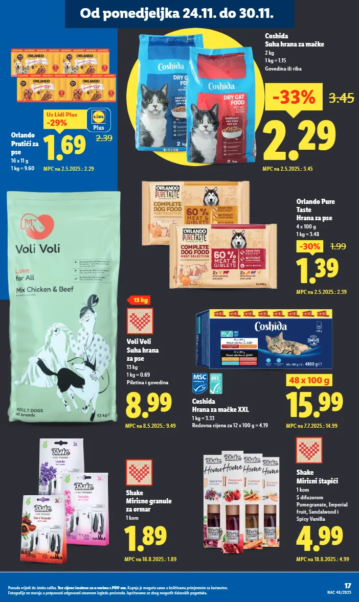 17 ponuda vrijedi do isteka zaliha. sve cijene izražene su u eurima s pdv-om. kupnja je moguća samo u količinama primjerenim za kućanstvo. fotografije ne moraju u potpunosti odgovarati stvarnom izgledu proizvoda. ispričavamo se zbog mogućih tiskarskih pogrešaka. nac 48/2025 od ponedjeljka 24.11. do 30.11. coshida suha hrana za mačke 2 kg 1 kg = 1.15 govedina ili riba orlando prutići za pse 16 x 11 g 1 kg = 9.60 shake mirisne granule za ormar 1 kom 1.89 mpc na 18.8.2025.: 1.89 1.39 -30% 1.99 mpc na 2.5.2025.: 2.39 orlando pure taste hrana za pse 4 x 100 g 1 kg = 3.48 2.39 1.69 -29% uz lidl plus mpc na 2.5.2025.: 2.29 shake mirisni štapići 1 kom s difuzorom pomegranate, imperial fruit, sandalwood i spicy vanilla 4.99 mpc na 18.8.2025.: 4.99 15.99 48 x 100 g mpc na 7.7.2025.: 14.99 coshida hrana za mačke xxl 1 kg = 3.33 redovna cijena za 12 x 100 g = 4.19 2.29 3.45 mpc na 2.5.2025.: 3.45 -33% 13 kg 8.99 mpc na 8.5.2025.: 9.49 voli voli suha hrana za pse 13 kg 1 kg = 0.69 piletina i govedina