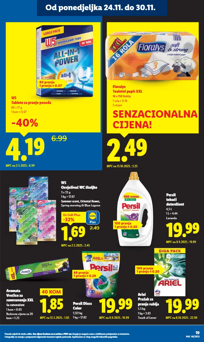 19 ǭàȕȡǼDzĊȝǿȋ¨ǼǿǼàǿóú¨ÏDzėDzȎǿ½Dzı ]Ċ¨ǿȋ¨ȕ¨ǿėȝDzę¨ȕ¨óȡȡ¨ȡȝǿȔDzóǭǞtƖàȔı ;ȡȜȕȋDzȋ¨Ȕà¸ȡDzóDzȔàȡÏàȎǿ ǿȕDzȔDzȜȝǿȔȋ¨ȝ¨ȕǿȔėDzÏȡDzȕóúĊàı %àúà¸ȝDz³ǿȋ¨ȕ¨ȔàȝDzȋȡȡȜàúȜȡȕàóúǿàǼ¸àĊDzȝDzúǿóúĊDzȝȕàȔǿė¸Ȏ¨ǼȡȜȝàǿėĊàǼDzıǢóȜȝǿ DzĊDzȔàó¨ėà¸Ȕà¸ȡǿ½úǿóÏDzȝóÏǿ½Ȝà¸ȝ¨õDzÏDzı DƟƣĮƝƛƝƠ ciÆÎ 6.99 W5 dÒ¨ú¨ėìïŲ̀ìàóÿ¦ 60 x 17 g 1 kom = 0.07 MPC na 2.5.2025.: 6.99 -40% ìï ÙÌ Ì ¨ ìà ìà óÿ óÿ óÿ ¦ ¦ ¦ ¦ QY=©© MPC na 8.9.2025.: 19.99 V¨ïóÀÒ ú¨ÏÿÀ ¤¨ú¨ï¤ę¨Ùú 4,5 L 1 L = 4.44 Lavanda QY=©© MPC na 6.10.2025.: 22.99 ïÀ¨Ò VïõÏė ìïŲ̀ïÿÒÌ 5.5 kg 1 kg = 3.63 Touch of Lenor Ò õ Ïė Ų̀ ïÿÒÌ Od ponedjeljka 24.11. do 30.11. `iÍÊ 40 KOM MPC na 12.5.2025.: 1.85 ïàØú tï¨À¨ė ėØïėĊŲ̀zz= ]ėúĊï ¨Ø 1 kom = 0.05 Redovna cijena za 20 kom = 1.23 100 pranja 1 pranje = 0.20 100 pranja 1 pranje = 0.20 60 pranja 1 pranje = 0.07 68 pranja 1 pranje = 0.29 W5 JóĊ̨ęÀĊ uõÏàÒÌϨ 3 x 33 g 1 kg = 17.07 ]ÿØØ¨ïó¨ÙúİJïÀ¨ÙúÒ·àċ¨ïİ Spring morning ili Blue Lagoon 2.49 `iËÎ -32% Uz Lidl Plus MPC na 2.5.2025.: 2.45 QY=©© MPC na 8.9.2025.: 19.99 V¨ïóÀÒÀóó àÒàï 1,122 kg 1 kg = 17.82 16 ROLA aiÉÎ MPC na 13.10.2025.: 3.25 SENZACIONALNA CIJENA! %ÒàïÒĒó dàÒ¨úÙÀììÀïzz= ƍƒĐƍƑƌÒÀóúÀ 1 rola = 0.16 3-slojni %ÒàïÒĒó dàÒ¨úÙÀ ììÀï zz=