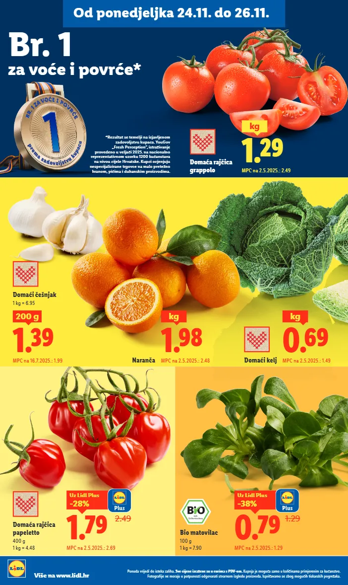 br. 1 za voće i povrće* *rezultat se temelji na izjavljenom zadovoljstvu kupaca. yougov „fresh perception”, istraživanje provedeno u veljači 2025. na nacionalno reprezentativnom uzorku 1200 kućanstava na nivou cijele hrvatske. kupci ocjenjuju nespecijalizirane trgovce na malo pretežno hranom, pićima i duhanskim proizvodima. mpc na 2.5.2025.: 1.29 1.29 0.79 -38% uz lidl plus mpc na 2.5.2025.: 2.69 2.49 1.79 -28% uz lidl plus domaća rajčica papeletto 400 g 1 kg = 4.48 bio matovilac 100 g 1 kg = 7.90 1.29 kg mpc na 2.5.2025.: 2.49 od ponedjeljka 24.11. do 26.11. ponuda vrijedi do isteka zaliha. sve cijene izražene su u eurima s pdv-om. kupnja je moguća samo u količinama primjerenim za kućanstvo. fotografije ne moraju u potpunosti odgovarati stvarnom izgledu proizvoda. ispričavamo se zbog mogućih tiskarskih pogrešaka. više na www.lidl.hr domaći češnjak 1 kg = 6.95 1.39 200 g mpc na 16.7.2025.: 1.99 naranča 1.98 kg mpc na 2.5.2025.: 2.48 domaći kelj 0.69 kg mpc na 2.5.2025.: 1.49 domaća rajčica grappolo