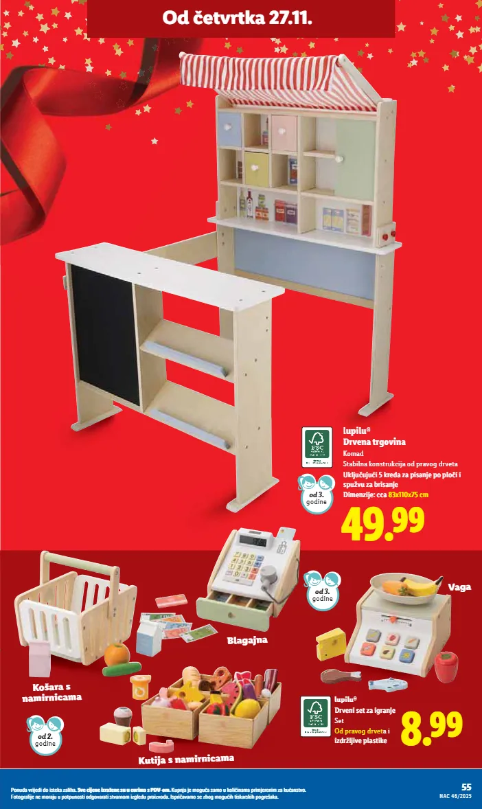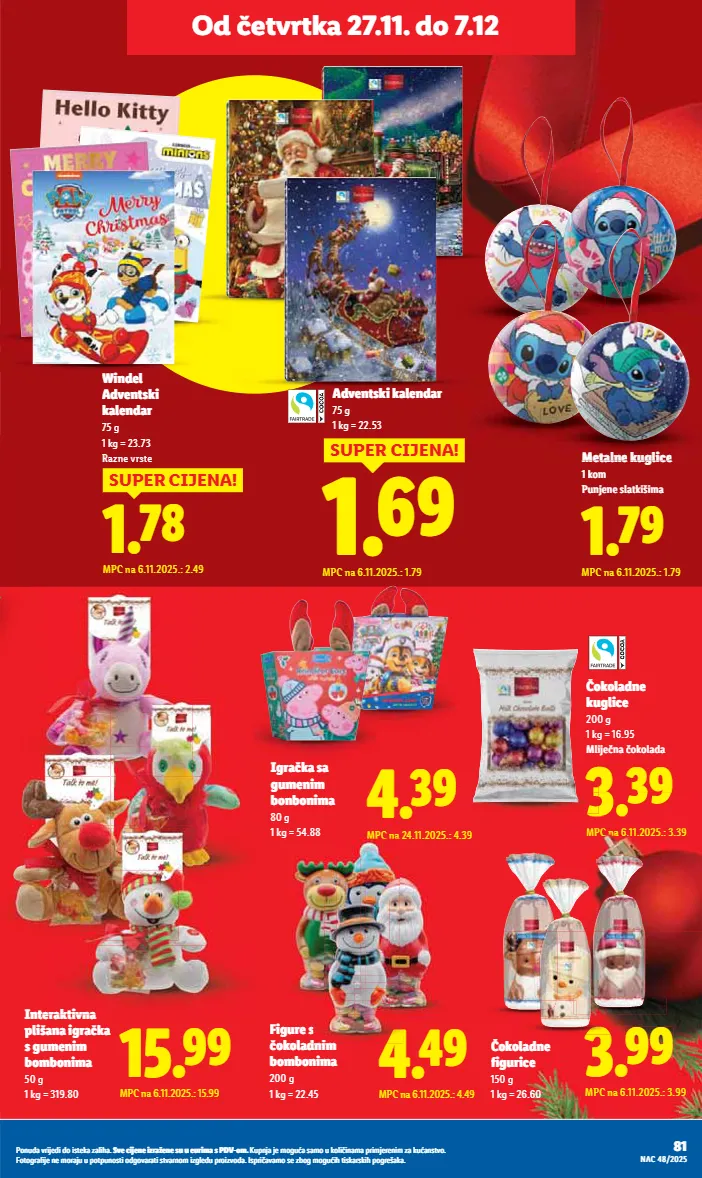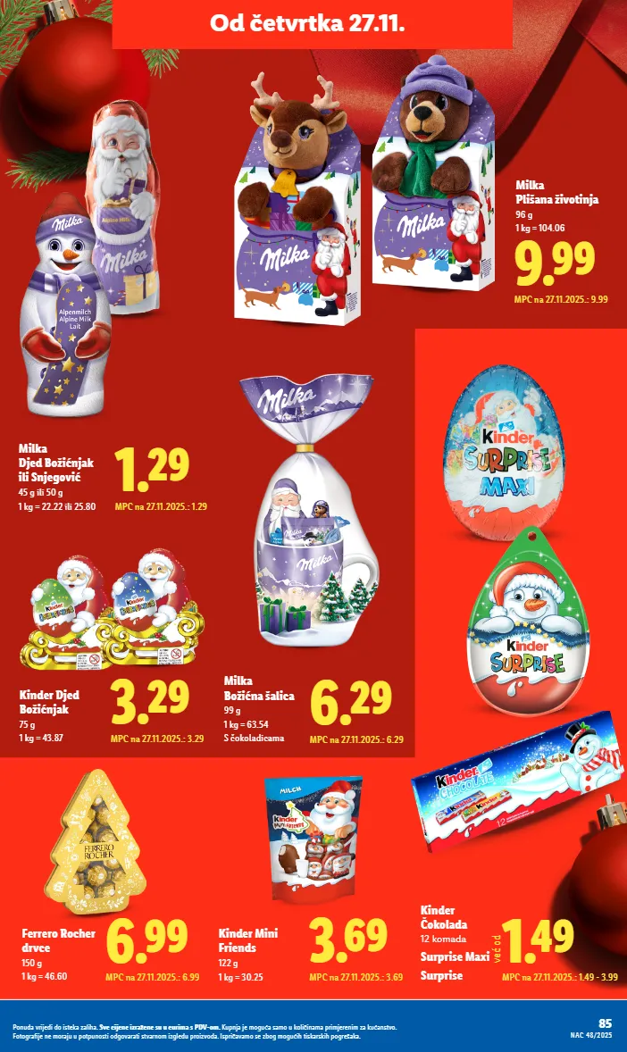 85 Ponuda vrijedi do isteka zaliha. Sve cijene izražene su u eurima s PDV-om. Kupnja je moguća samo u količinama primjerenim za kućanstvo. Fotografije ne moraju u potpunosti odgovarati stvarnom izgledu proizvoda. Ispričavamo se zbog mogućih tiskarskih pogrešaka. NAC 48/2025 Od četvrtka 27.11. Milka Božićna šalica 99 g 1 kg = 63.54 S čokoladicama Milka Djed Božićnjak ili Snjegović 45 g ili 50 g 1 kg = 22.22 ili 25.80 1.29 MPC na 27.11.2025.: 1.29 1.49 MPC na 27.11.2025.: 1.49 - 3.99 već od 3.29 MPC na 27.11.2025.: 3.29 Kinder Djed Božićnjak 75 g 1 kg = 43.87 9.99 MPC na 27.11.2025.: 9.99 Milka Plišana životinja 96 g 1 kg = 104.06 6.29 MPC na 27.11.2025.: 6.29 3.69 MPC na 27.11.2025.: 3.69 Kinder Mini Friends 122 g 1 kg = 30.25 6.99 MPC na 27.11.2025.: 6.99 Ferrero Rocher drvce 150 g 1 kg = 46.60 Surprise Maxi Surprise Kinder Čokolada 12 komada