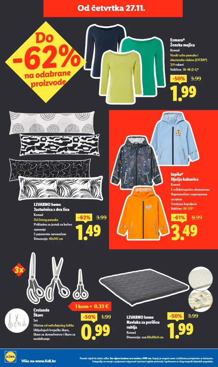 livarno home jastučnica s dva lica komad od čistog pamuka prikladna za jastuk za bočno spavanje s patentnim zatvaračem dimenzije: 40x145 cm -62% 1.49 3.99 esmara® ženska majica komad visoki udio pamuka i elastansko vlakno (lycra®) 3/4 rukavi veličine: 36-46 (s-l)* -50% 1.99 3.99 lupilu® dječja kabanica komad s reflektirajućim elementima nepromočiva i nepropusna za vjetar troslojna kapuljača veličine: 86-128* -61% 3.49 8.99 do -62% na odabrane proizvode od četvrtka 27.11. crelando škare set oštrice od nehrđajućeg čelika uključujući krojačke škare, škare za domaćinstvo i škare za modeliranje -50% 0.99 1.99 3x livarno home navlaka za perilicu rublja komad dimenzije: cca 60x60x4 cm -50% 1.99 3.99 1 kom = 0.33 € ponuda vrijedi do isteka zaliha. sve cijene izražene su u eurima s pdv-om. kupnja je moguća samo u količinama primjerenim za kućanstvo. fotografije ne moraju u potpunosti odgovarati stvarnom izgledu proizvoda. ispričavamo se zbog mogućih tiskarskih pogrešaka. više na www.lidl.hr