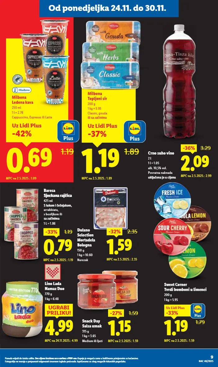 od ponedjeljka 24.11. do 30.11. lino lada namaz duo 770 g 1 kg = 6.48 1.79 `iæî -33% uz lidl plus mpc na 2.5.2025.: 1.59 sweet corner tvrdi bomboni u limenci 200 g 1 kg = 5.95 uz lidl plus -42% _iëî 1.19 milbona ledena kava 250 ml 1 l = 2.76 cappuccino, espresso ili latte mpc na 2.5.2025.: 1.09 t c ciîî ugrabi priliku! mpc na 24.11.2025.: 4.99 snack day salsa umak 315 g 1 kg = 3.65 medium ili ljuti 9 ǭàȕȡǽdzċȝǿȋ¨ǽǿǽàǿóú¨ïdzėdzȏǿ½dzı ]ċ¨ǿȋ¨ȕ¨ǿėȝdzę¨ȕ¨óȡȡ¨ȡȝǿȕdzóǭǟtɩàȕı ;ȡȝȕȋdzȋ¨ȕà¸ȡdzódzȕàȡïàȏǿ ǿȕdzȕdzȝȝǿȕȋ¨ȝ¨ȕǿȕėdzïȡdzȕóúċàı %àúà¸ȝdz³ǿȋ¨ȕ¨ȕàȝdzȋȡȡȝàúȝȡȕàóúǿàǽ¸àċdzȝdzúǿóúċdzȝȕàȕǿė¸ȏ¨ǽȡȝȝàǿėċàǽdzıǣóȝȝǿ dzċdzȕàó¨ėà¸ȕà¸ȡǿ½úǿóïdzȝóïǿ½ȝà¸ȝ¨õdzïdzı dɵƣįɲƛɲơ uz lidl plus -37% `iæî 1.89 milbona topljeni sir 200 g 1 kg = 5.95 classic, gouda àòàóė àùàø mpc na 2.5.2025.: 1.89 _iìî -33% 1.19 mpc na 2.5.2025.: 1.19 mp baresa ]ì¨ïùïì à 425 ml ]òÿïàøà ¨õùìïàøi̇ arrabbiata, s bosiljkom ili óė àùàø 1 l = 1.86 dulano selection mortadela bologna 150 g 1 kg = 10.60 narezak aiåî -36% 3.29 mpc na 2.5.2025.: 2.99 crno suho vino 2 l 1 l = 1.05 alk. 10,5% vol. povratna naknada ÿïòìÿ ¨ùì¨ÿàì¨ùÿ `iêî -32% 2.35 mpc na 2.5.2025.: 2.35 `iæê -27% 1.59 mpc na 2.5.2025.: 1.59