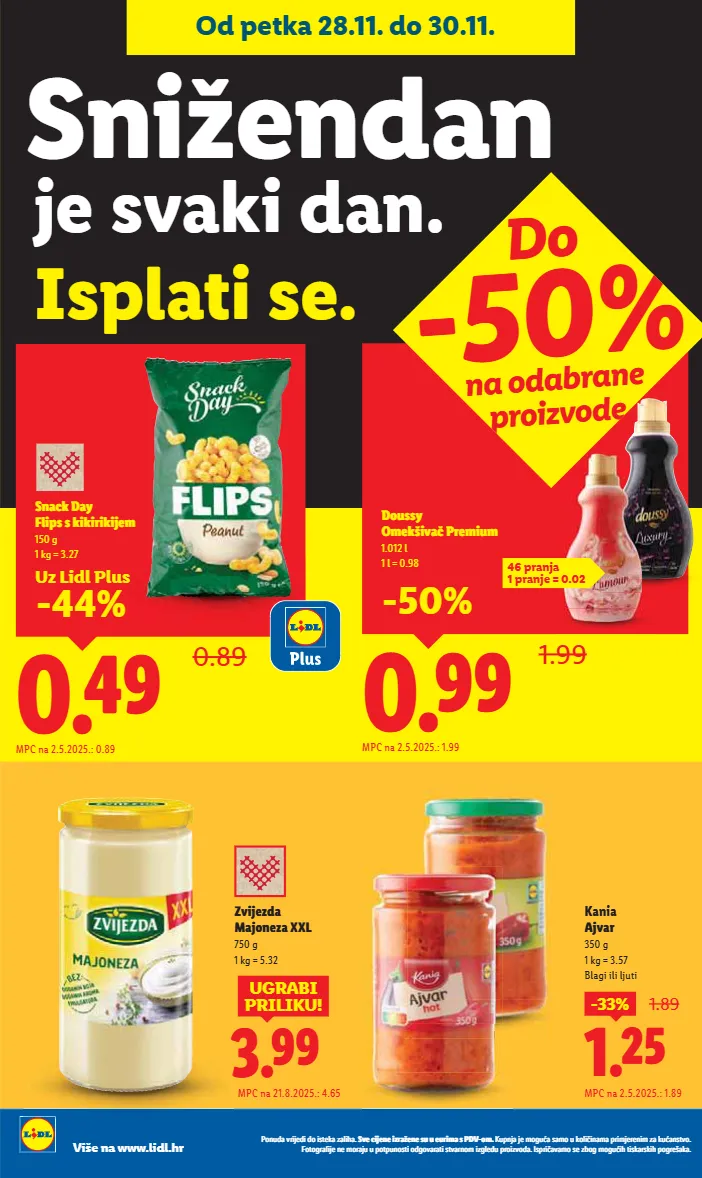 ǭàȕȡǼDzĊȝǿȋ¨ǼǿǼàǿóú¨ÏDzėDzȎǿ½Dzı ]Ċ¨ǿȋ¨ȕ¨ǿėȝDzę¨ȕ¨óȡȡ¨ȡȝǿȔDzóǭǞtƖàȔı ;ȡȜȕȋDzȋ¨Ȕà¸ȡDzóDzȔàȡÏàȎǿ ǿȕDzȔDzȜȝǿȔȋ¨ȝ¨ȕǿȔėDzÏȡDzȕóúĊàı %àúà¸ȝDz³ǿȋ¨ȕ¨ȔàȝDzȋȡȡȜàúȜȡȕàóúǿàǼ¸àĊDzȝDzúǿóúĊDzȝȕàȔǿė¸Ȏ¨ǼȡȜȝàǿėĊàǼDzıǢóȜȝǿ DzĊDzȔàó¨ėà¸Ȕà¸ȡǿ½úǿóÏDzȝóÏǿ½Ȝà¸ȝ¨õDzÏDzı Više na www.lidl.hr _iÎÎ 1.99 àÿóóĒ JبÏõÀĊ Vï¨ØÀÿØ 1.012 l 1 l = 0.98 MPC na 2.5.2025.: 1.99 -50% _iÉÎ 0.89 ]ÙÏĒ %ÒÀìóóÏÀÏÀïÀÏÀÌ¨Ø 150 g 1 kg = 3.27 MPC na 2.5.2025.: 0.89 -44% Od petka 28.11. do 30.11. je svaki dan. .óìÒúǿó¨ı ]ÙÀę¨Ù¤Ù `iÇÊ -33% 1.89 MPC na 2.5.2025.: 1.89 Kania ÌĊï 350 g 1 kg = 3.57 Blagi ili ljuti biÎÎ UGRABI PRILIKU! MPC na 21.8.2025.: 4.65 ĊÀÌ¨ė¤ CÌàÙ¨ėzz= 750 g 1 kg = 5.32 Do -50% na odabrane proizvode 46 pranja 1 pranje = 0.02 Uz Lidl Plus