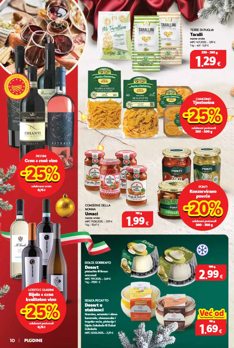 terre di puglia taralli razne vrste mpc 14.11.2025. = 1,89 € 1 kg = 4,61 - 5,61 € 1 1 . . 29 29 € 230 - 280 g conserve della nonna umaci razne vrste mpc 19.08.2025. = 2,99 € 1 kg = 10,47 € 1 1 . . 99 99 € 190 g -20% -20% ponti konzervirano povrće odabrani proizvodi 300 - 350 g -25% -25% piccini crno ili rosé vino odabrane vrste 0,75 l -25% -25% losito e guarini bijelo ili crno kvalitetno vino odabrani proizvodi 0,75 l senza pecatto desert u staklenci tiramisu, amareto i slana karamela, cheesecake i tropsko voće, pistacija i bijela čokolada ili dubai čokolada mpc 02.05.2025. = 2,29 € top cijena! već od hit cijena! 1 1 . . 69 69 € 110 g već od već od -25% -25% camerino tjestenina odabrani proizvodi 250 - 500 g dolce sorrento desert pistachio ili limun smrznuti mpc 19.11.2025. = 3,49 € 1 kg = 29,90 € 2 2 . . 99 99 € 100 g 10