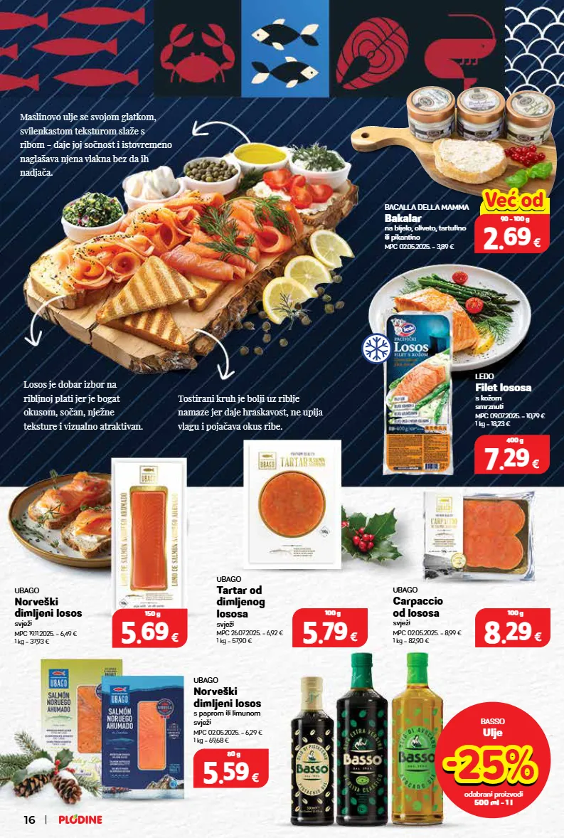 ubago tartar od dimljenog lososa svježi mpc 26.07.2025. = 6,92 € 1 kg = 57,90 € 5 5 . . 79 79 € 100 g ubago carpaccio od lososa svježi mpc 02.05.2025. = 8,99 € 1 kg = 82,90 € 8 8 . . 29 29 € 100 g ubago norveški dimljeni losos svježi mpc 19.11.2025. = 6,49 € 1 kg = 37,93 € 5 5 . . 69 69 € 150 g ubago norveški dimljeni losos s paprom ili limunom svježi mpc 02.05.2025. = 6,29 € 1 kg = 69,68 € 5 5 . . 59 59 € 80 g -25% -25% basso ulje odabrani proizvodi 500 ml - 1 l bacalla della mamma bakalar na bijelo, oliveto, tartufino ili pikantino mpc 02.05.2025. = 3,89 € top cijena! već od hit cijena! 2 2 . . 69 69 € 90 - 100 g već od već od tostirani kruh je bolji uz riblje namaze jer daje hraskavost, ne upija vlagu i pojačava okus ribe. losos je dobar izbor na ribljnoj plati jer je bogat okusom, sočan, nježne teksture i vizualno atraktivan. maslinovo ulje se svojom glatkom, svilenkastom teksturom slaže s ribom - daje joj sočnost i istovremeno naglašava njena vlakna bez da ih nadjača. ledo filet lososa s kožom smrznuti mpc 09.07.2025. = 10,79 € 1 kg = 18,23 € 7 7 . . 29 29 € 400 g 16