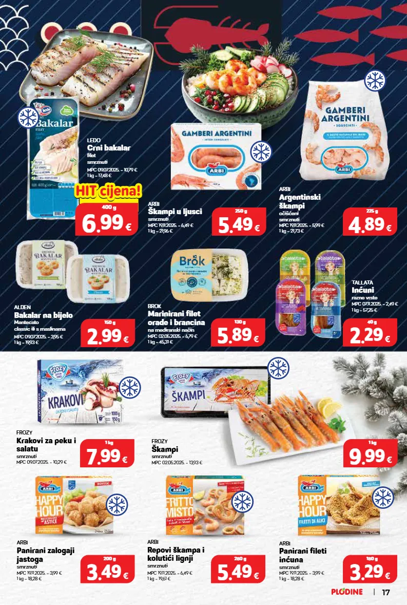 BROK Marinirani filet orade i brancina na mediranski način MPC 02.05.2025. = 6,79 € 1 kg = 45,31 € 5 5 . . 89 89 € 130 g ALDEN Bakalar na bijelo Mantecato classic ili s maslinama MPC 09.07.2025. = 3,95 € 1 kg = 19,93 € 2 2 . . 99 99 € 150 g FROZY Krakovi za peku i salatu smrznuti MPC 09.07.2025. = 10,29 € 7 7 . . 99 99 € 1 kg ARBI Panirani zalogaji jastoga smrznuti MPC 19.11.2025. = 3,99 € 1 kg = 18,28 € 3 3 . . 49 49 € 200 g TALLATA Inćuni razne vrste MPC 07.11.2025. = 2,49 € 1 kg = 57,25 € 2 2 . . 29 29 € 40 g LEDO Crni bakalar filet smrznuti MPC 09.07.2025. = 10,79 € 1 kg = 17,48 € ARBI Repovi škampa i kolutići lignji smrznuti MPC 19.11.2025. = 6,49 € 1 kg = 19,61 € 5 5 . . 49 49 € 280 g FROZY Škampi smrznuti MPC 02.05.2025. = 13,93 € 9 9 . . 99 99 € 1 kg ARBI Panirani fileti inćuna smrznuti MPC 19.11.2025. = 3,99 € 1 kg = 18,28 € 3 3 . . 29 29 € 180 g ARBI Argentinski škampi očišćeni smrznuti MPC 19.11.2025. = 5,99 € 1 kg = 21,73 € 4 4 . . 89 89 € 225 g ARBI Škampi u ljusci smrznuti MPC 19.11.2025. = 6,49 € 1 kg = 21,96 € 5 5 . . 49 49 € 250 g TOP cijena! Već od HIT cijena! 6 6 . . 99 99 € 400 g HIT HIT cijena! cijena! 17
