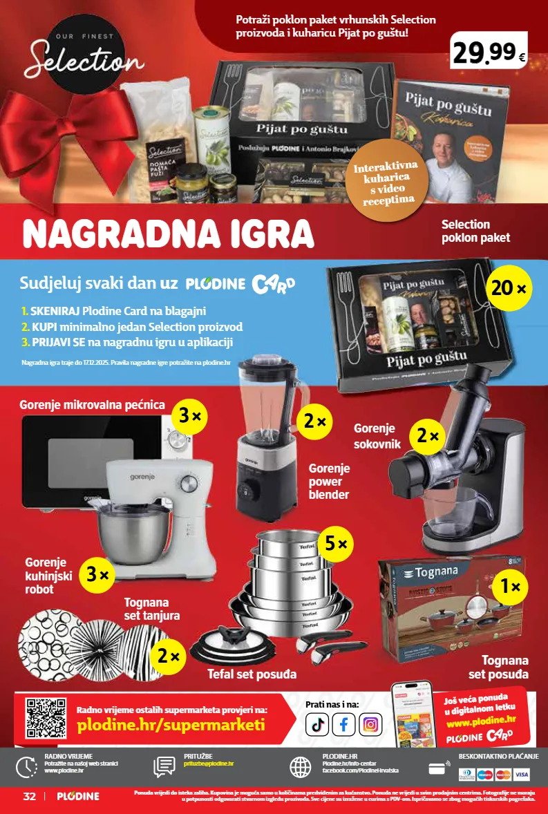 %%%%%%%%%%%%%%%% %%%%%%%%%%%%%%%% %%%%%%%%%%%%%%%% %%%%%%%%%%%%%%%% prati nas i na: ponuda vrijedi do isteka zaliha. kupovina je moguća samo u količinama predviđenim za kućanstvo. ponuda ne vrijedi u svim prodajnim centrima. fotografije ne moraju u potpunosti odgovarati stvarnom izgledu prozivoda. sve cijene su izražene u eurima s pdv-om. ispričavamo se zbog mogućih tiskarskih pogrešaka. radno vrijeme potražite na našoj web stranici www.plodine.hr pritužbe prituzbe@plodine.hr plodine.hr plodine.hr/info-centar facebook.com/plodinehrvatska beskontaktno plaćanje još veća ponuda u digitalnom letku www.plodine.hr radno vrijeme ostalih supermarketa provjeri na: plodine.hr/supermarketi potraži poklon paket vrhunskih selection proizvoda i kuharicu pijat po guštu! 2 × gorenje power blender 2 × gorenje sokovnik 20 × selection poklon paket 5 × tefal set posuđa 3 × gorenje mikrovalna pećnica 3 × gorenje kuhinjski robot nagradna igra 2 × tognana set tanjura interaktivna kuharica s video receptima 1 × tognana set posuđa sudjeluj svaki dan uz 29 29 . . 99 99 € 1. skeniraj plodine card na blagajni 2. kupi minimalno jedan selection proizvod 3. prijavi se na nagradnu igru u aplikaciji nagradna igra traje do 17.12.2025. pravila nagradne igre potražite na plodine.hr 32