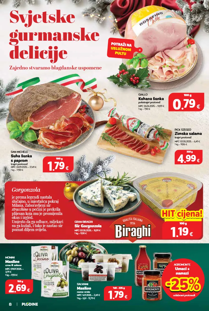 1 1 . . 79 79 € 100 g 4 4 . . 99 99 € 250 g san michele suha šunka s paprom trajni proizvod mpc 24.09.2025. = 21,49 € 1 kg = 17,90 € gran biraghi sir gorgonzola mpc 02.05.2025. = 15,99 € 1 kg = 11,90 € top cijena! već od hit cijena! 1 1 . . 19 19 € 100 g hit hit cijena! cijena! pick szeged zimska salama trajni proizvod mpc 02.05.2025. = 6,49 € 1 kg = 19,96 € gorgonzola je prema legendi nastala slučajno, u mjestašcu pokraj milana. zaboravljeni sir stracchino u pećini je prekrila plijesan koja mu je promijenila okus i izgled. umjesto da ga odbace, mljekari su ga kušali, i tako je nastao sir poznat diljem svijeta. monini masline crne ili zelene mpc 09.07.2025. = 3,79 € 1 kg = 17,93 € 2 2 . . 69 69 € 150 g salviani masline razne vrste mpc 14.11.2025. = 2,49 € 1 kg = 5,51 - 12,79 € 1 1 . . 79 79 € 140 - 325 g -25% -25% agromonte umaci ili namazi odabrani proizvodi giallo kuhana šunka polutrajni proizvod mpc 26.06.2025. = 10,99 € 1 kg = 7,90 € 0 0 . . 79 79 € 100 g potraži na uslužnom pultu svjetske gurmanske delicije zajedno stvaramo blagdanske uspomene 8