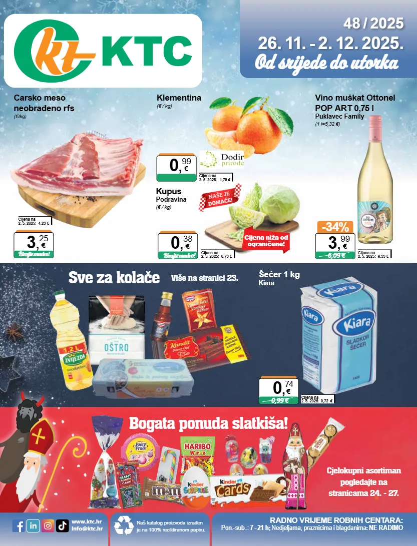 naš katalog proizvoda izrađen je na 100% recikliranom papiru. radno vrijeme robnih centara: pon.-sub..: 7 - 21 h ; nedjeljama, praznicima i blagdanima : ne radimo www.ktc.hr info@ktc.hr 48 / 2025 26. 11. - 2. 12. 2025. od srijede do utorka cijena na 2. 5. 2025: 0,72 € cijena na 2. 5. 2025: 6,99 € cijena na 2. 5. 2025: 1,79 € cijena na 2. 5. 2025: 0,79 € cijena na 2. 5. 2025: 4,29 € šećer 1 kg kiara 0,99 € 0 , 74 € bogata ponuda slatkiša! sve za kolače cjelokupni asortiman pogledajte na stranicama 24. - 27. više na stranici 23. vino muškat ottonel pop art 0,75 l puklavec family (1 l=5,32 €) -34% 6,09 € 3 , 99 € klementina (€ / kg) 0 , 99 € kupus podravina (€ / kg) birajte mudro! 0 , 38 € cijena niža od ograničene! carsko meso neobrađeno rfs (€/kg) birajte mudro! 3 , 25 €