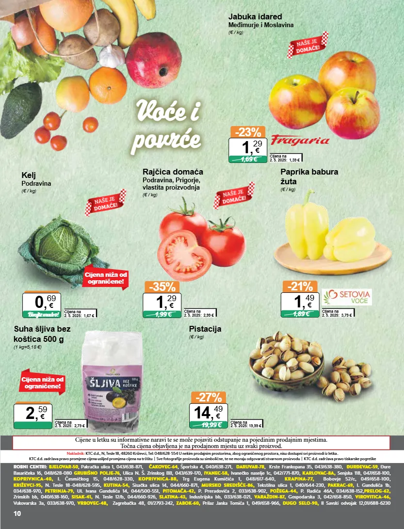 nakladnik: ktc d.d., n, tesle 18, 48260 križevci, tel: 048/628-554 u nekim prodajnim prostorima, zbog ograničenog prostora, nisu dostupni svi proizvodi iz letka . ktc d.d. zadržava pravo promjene cijena uslijed promjena cijena na tržištu | sve fotografije proizvoda su simbolične, te ne moraju odgovarati stvarnom proizvodu | ktc d.d. zadržava pravo tiskarske pogreške robni centri: bjelovar-50 , pakračka ulica 1, 043/638-871, čakovec-64 , športska 4, 040/638-271, daruvar-78 , krste frankopana 35, 043/638-380, đurđevac-59 , đure basaričeka 16, 048/628-080 grubišno polje-76 , ulica n. š. zrinskog bb, 043/639-170, ivanec-58, ivanečko naselje 1c, 042/771-870, karlovac-8a, senjska 118, 047/658-100, koprivnica-40, i. česmičkog 15, 048/628-330, koprivnica-88, trg eugena kumičića 1, 048/617-640, krapina-77, bobovje 52/c, 049/658-100, križevci-95, n. tesle 18–048/628-595, kutina-54, sisačka ulica 14, 044/660-871, mursko središće-86, tekstilna ulica 1, 040/644-230, pakrac-69, i. gundulića 1b, 034/638-970, petrinja-79, ul. ivana gundulića 14, 044/500-551, pitomača-42, p. preradovića 2, 033/638-902, požega-44, p. radića 46a, 034/638-152, prelog-62, zrinskih bb, 040/638-160, sisak-41, n. tesle 12/b, 044/660-926, slatina-43, industrijska bb, 033/638-021, varaždin-87, gospodarska 3, 042/658-850, virovitica-46, vukovarska 3a, 033/638-970, vrbovec-48, zagrebačka 48, 01/2793-242, zabok-60, prilaz janka tomića 1, 049/658-966, dugo selo-90, ii savski odvojak 12,01/688-6230 cijene u letku su informativne naravi te se može pojaviti odstupanje na pojedinim prodajnim mjestima. točna cijena objavljena je na prodajnom mjestu uz svaki proizvod. 10 voće i povrće cijena na 2. 5. 2025: 2,79 € cijena na 2. 5. 2025: 19,99 € cijena na 2. 5. 2025: 1,39 € cijena na 2. 5. 2025: 3,79 € cijena na 2. 5. 2025: 2,99 € cijena na 2. 5. 2025: 1,67 € suha šljiva bez koštica 500 g (1 kg=5,18 €) 2 , 59 € pistacija (€ / kg) jabuka idared međimurje i moslavina (€ / kg) paprika babura žuta (€ / kg) -27% 19,99 € 14 , 49 € -23% 1,69 € 1 , 29 € -21% 1,89 € 1 , 49 € rajčica domaća podravina, prigorje, vlastita proizvodnja (€ / kg) -35% 1,99 € 1 , 29 € kelj podravina (€ / kg) birajte mudro! 0 , 69 € cijena niža od ograničene! cijena niža od ograničene!