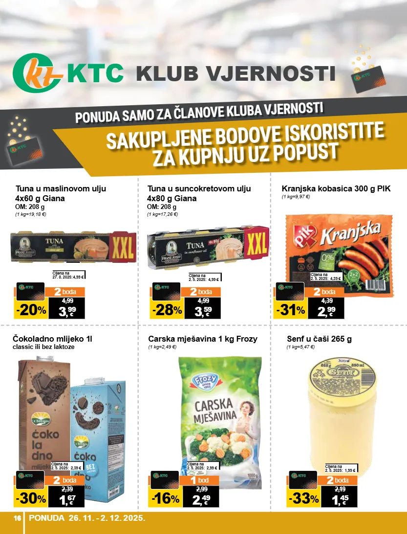 ponuda samo za članove kluba vjernosti sakupljene bodove iskoristite za kupnju uz popust klub vjernosti 16 ponuda 17.9. - 23.9.2025. 16 ponuda 26. 11. - 2. 12. 2025. čokoladno mlijeko 1l classic ili bez laktoze cijena na 2. 5. 2025: 2,39 € 2,39 1 , 67 - 30 % 2 boda € cijena na 2. 5. 2025: 2,99 € 2,99 2 , 49 - 16 % 1 bod € cijena na 2. 5. 2025: 1,99 € 2,19 1 , 45 - 33 % 2 boda € cijena na 27. 8. 2025: 4,99 € 4,99 3 , 99 - 20 % 2 boda € cijena na 2. 5. 2025: 4,99 € 4,99 3 , 59 - 28 % 2 boda € cijena na 2. 5. 2025: 4,39 € 4,39 2 , 99 - 31 % 2 boda € carska mješavina 1 kg frozy (1 kg=2,49 €) senf u čaši 265 g (1 kg=5,47 €) tuna u maslinovom ulju 4x60 g giana om: 208 g (1 kg=19,18 €) tuna u suncokretovom ulju 4x80 g giana om: 208 g (1 kg=17,26 €) kranjska kobasica 300 g pik (1 kg=9,97 €)