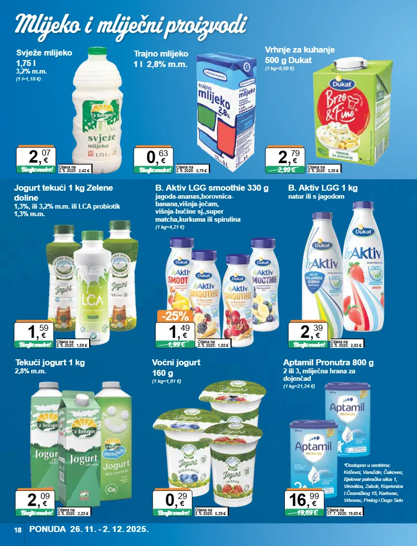 18 mlijeko i mliječni proizvodi ponuda 26. 11. - 2. 12. 2025. cijena na 2. 5. 2025: 1,59 € cijena na 2. 5. 2025: 0,39 € cijena na 2. 5. 2025: 0,79 € cijena na 2. 5. 2025: 1,82 € cijena na 2. 5. 2025: 2,82 € cijena na 2. 5. 2025: 3,39 € cijena na 2. 5. 2025: 2,42 € cijena na 2. 5. 2025: 2,22 € cijena na 17. 7. 2025: 19,69 € jogurt tekući 1 kg zelene doline 1,3%, ili 3,2% m.m. ili lca probiotik 1,3% m.m. birajte mudro! 1 , 59 € voćni jogurt 160 g (1 kg=1,81 €) birajte mudro! 0 , 29 € trajno mlijeko 1 l 2,8% m.m. birajte mudro! 0 , 63 € b. aktiv lgg smoothie 330 g jagoda-ananas,borovnica- banana,višnja-ječam, višnja-bučine sj.,super matcha,kurkuma ili spirulina (1 kg=4,21 €) -25% 1,99 € 1 , 49 € b. aktiv lgg 1 kg natur ili s jagodom birajte mudro! 2 , 39 € vrhnje za kuhanje 500 g dukat (1 kg=5,58 €) 2,99 € 2 , 79 € svježe mlijeko 1,75 l 3,2% m.m. (1 l=1,18 €) birajte mudro! 2 , 07 € tekući jogurt 1 kg 2,8% m.m. birajte mudro! 2 , 09 € aptamil pronutra 800 g 2 ili 3, mliječna hrana za dojenčad (1 kg=21,24 €) 19,69 € 16 , 99 € *dostupno u centrima: križevci, varaždin, čakovec, bjelovar pakračka ulica 1, virovitica, zabok, koprivnica i.česmičkog 15, karlovac, vrbovec, prelog i dugo selo