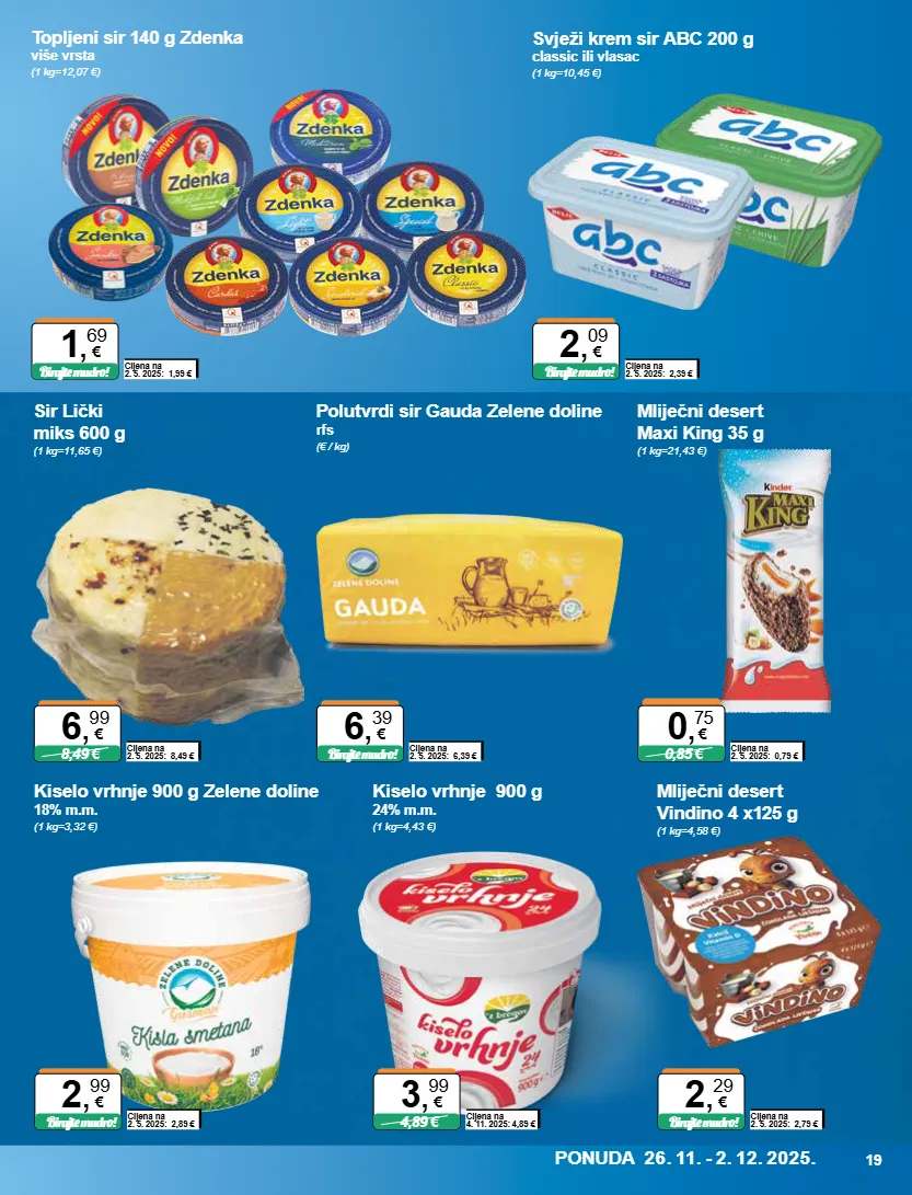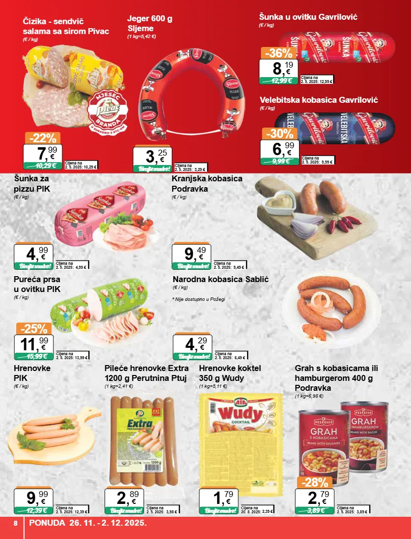 ponuda 1. 12. - 2. 12. 2025. 13 cijena na 2. 5. 2025: 1,72 € cijena na 2. 5. 2025: 2,15 € cijena na 2. 5. 2025: 8,49 € cijena na 2. 5. 2025: 7,99 € cijena na 2. 5. 2025: 1,33 € cijena na 3. 11. 2025:1,69 € cijena na 3. 11. 2025:3,19 € cijena na 2. 5. 2025: 1,59 € cijena na 2. 5. 2025: 4,49 € pileća ili pureća prsa 60 g lino podravka (1 kg=21,50 €) -25% 1,72 € 1 , 29 € šunka narezak 150 g gavrilović (1 kg=11,00 €) -23% 2,15 € 1 , 65 € vikend kobasica kudelić (€ / kg) 8,99 € 7 , 99 € panirani pileći medaljoni 660g i panirani pileći medaljoni sa sirom 660g cekin smrznuto (1 kg=9,08 €) 5 , 99 € mliječni namaz 150 g s biljem, vrhnjem ili tunom (1 kg=7,93 €) birajte mudro! 1 , 19 € bananko mini 120 g (1 kg=10,75 €) birajte mudro! 1 , 29 € tortica mini original 120 g (1 kg=20,75 €) birajte mudro! 2 , 49 € gumeni bomboni 150 g zozole painter (1 kg=8,33 €) -21% 1,59 € 1 , 25 € * nije dostupno u požegi pommes frites 1 kg ledo -26% 4,49 € 3 , 29 €