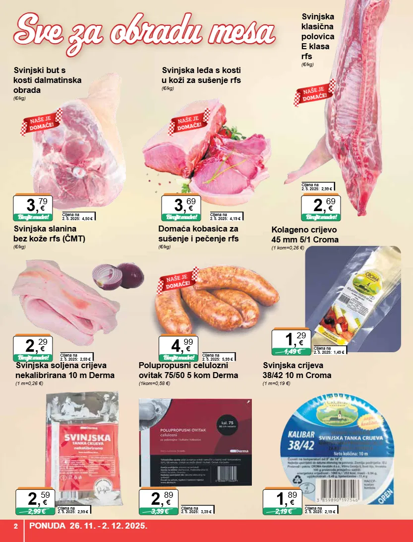 ponuda 26. 11. - 2. 12. 2025. 2 sve za obradu mesa sve za obradu mesa cijena na 2. 5. 2025: 2,99 € cijena na 2. 5. 2025: 3,39 € cijena na 2. 5. 2025: 2,19 € cijena na 2. 5. 2025: 1,49 € cijena na 2. 5. 2025: 2,99 € cijena na 2. 5. 2025: 4,19 € cijena na 2. 5. 2025: 4,50 € cijena na 2. 5. 2025: 2,59 € cijena na 2. 5. 2025: 5,99 € svinjska soljena crijeva nekalibrirana 10 m derma (1 m=0,26 €) 2,99 € 2 , 59 € polupropusni celulozni ovitak 75/50 5 kom derma (1kom=0,58 €) 3,39 € 2 , 89 € svinjska crijeva 38/42 10 m croma (1 m=0,19 €) 2,19 € 1 , 89 € kolageno crijevo 45 mm 5/1 croma (1 kom=0,26 €) 1,49 € 1 , 29 € svinjska leđa s kosti u koži za sušenje rfs (€/kg) domaća kobasica za sušenje i pečenje rfs (€/kg) svinjska klasična polovica e klasa rfs (€/kg) svinjski but s kosti dalmatinska obrada (€/kg) svinjska slanina bez kože rfs (čmt) (€/kg) birajte mudro! 2 , 69 € birajte mudro! 3 , 79 € birajte mudro! 4 , 99 € birajte mudro! 2 , 29 € birajte mudro! 3 , 69 €