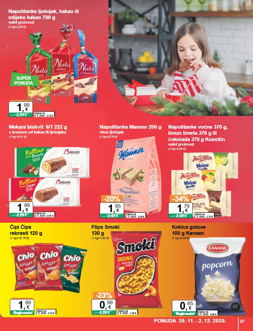 25 ponuda 26. 11. - 2. 12. 2025. cijena na 2. 5. 2025: 1,45 € cijena na 2. 5. 2025: 0,80 € cijena na 2. 5. 2025: 1,09 € cijena na 2. 5. 2025: 1,60 € cijena na 2. 5. 2025: 1,89 € cijena na 2. 5. 2025: 2,29 € cijena na 2. 5. 2025: 2,48 - 2,49 € *akcijske cijene su izražene na polici -25% cijena na 2. 5. 2025: 1,99 € cijena na 2. 5. 2025: 0,99 € cijena na 20. 10. 2025: 2,49 € gumeni bomboni haribo 100 g zlatni medo, happy cola, mekani medo ili jagode (1 kg=11,90 €) 1,45 € 1 , 19 € djed božićnjak ili sv. nikola 60 g (1 kg=10,83 €) 0 , 65 € vrećica mix djed božićnjak ili sv. nikola 100 g (1 kg=12,5 €) 1 , 25 € ferrero rocher 50 g (1 kg=29,80 €) 1,50 € 1 , 49 € 1,99 € 1 , 45 € žvakaće juicy fruit tape okus fancy fruit ili cola 56 g (1 kg=30,18 €) -26% 2,29 € 1 , 69 € čokolada milka 87,5 g-100 g odabrane vrste (1 kg=21,6-15,9 €) 1 , 59 € čokolada mliječna dorina punjena ledenim, jaffa, punch, caramel almond 100 g (1 kg=14,50 €) , cocolada, creamy hazelnut 98 g (1 kg=14,80 €) , mousse, strawberry vanilla 95 g (1 kg=15,26 €) m&m bomboni choco ili kikiriki 45 g-200 g eurocrem blok milky 4 x 20 g 80g (1 kg=9,88 €) -28% 1,10 € 0 , 79 € wafer rolls 170 g vafel punjen kremom (1 kg=11,47 €) 2,49 € 1 , 95 €