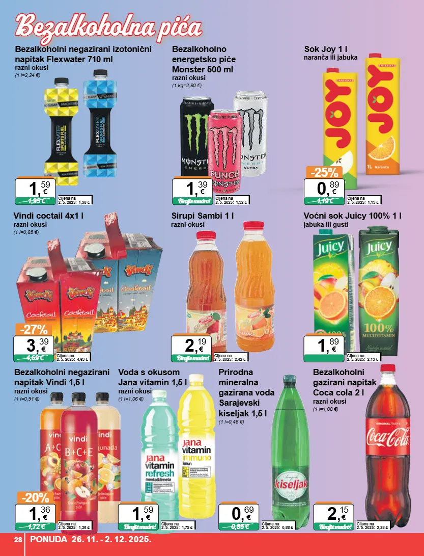 ponuda 26. 11. - 2. 12. 2025. 28 bezalkoholna pića bezalkoholna pića cijena na 2. 5. 2025: 0,88 € cijena na 2. 5. 2025: 2,28 € cijena na 2. 5. 2025: 2,42 € cijena na 2. 5. 2025: 1,92 € cijena na 2. 5. 2025: 1,79 € cijena na 2. 5. 2025: 1,36 € cijena na 2. 5. 2025: 1,98 € cijena na 2. 5. 2025: 4,69 € cijena na 2. 5. 2025: 1,19 € cijena na 2. 5. 2025: 2,19 € prirodna mineralna gazirana voda sarajevski kiseljak 1,5 l (1 l=0,46 €) 0,85 € 0 , 69 € bezalkoholni gazirani napitak coca cola 2 l razni okusi (1 l=1,08 €) birajte mudro! 2 , 15 € sirupi sambi 1 l razni okusi birajte mudro! 2 , 19 € bezalkoholno energetsko piće monster 500 ml razni okusi (1 kg=2,80 €) birajte mudro! 1 , 39 € voda s okusom jana vitamin 1,5 l razni okusi (1 l=1,06 €) birajte mudro! 1 , 59 € bezalkoholni negazirani napitak vindi 1,5 l razni okusi (1 l=0,91 €) -20% 1,72 € 1 , 36 € bezalkoholni negazirani izotonični napitak flexwater 710 ml razni okusi (1 l=2,24 €) 1,95 € 1 , 59 € vindi coctail 4x1 l razni okusi (1 l=0,85 €) -27% 4,69 € 3 , 39 € sok joy 1 l naranča ili jabuka -25% 1,19 € 0 , 89 € voćni sok juicy 100% 1 l jabuka ili gusti 1 , 89 €