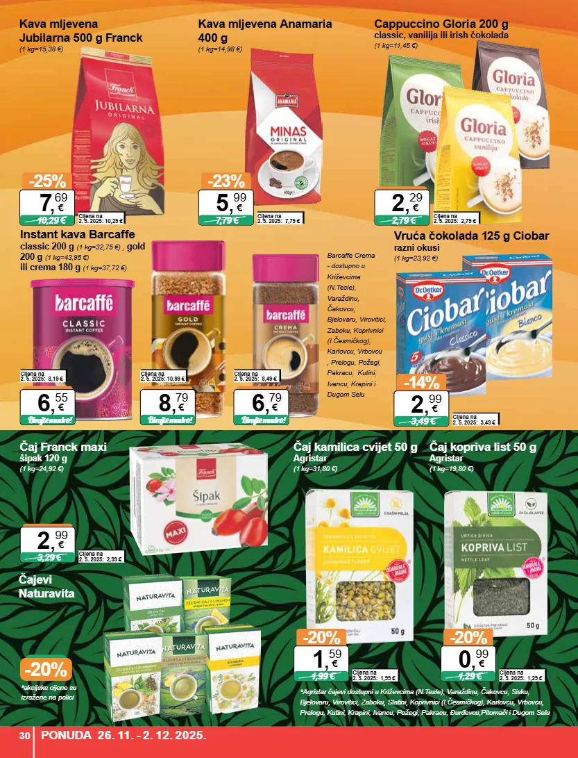ponuda 26. 11. - 2. 12. 2025. 30 *akcijske cijene su izražene na polici -20% cijena na 2. 5. 2025: 10,29 € cijena na 2. 5. 2025: 7,79 € cijena na 2. 5. 2025: 2,79 € cijena na 2. 5. 2025: 8,19 € cijena na 2. 5. 2025: 10,99 € cijena na 2. 5. 2025: 8,49 € cijena na 2. 5. 2025: 2,99 € cijena na 2. 5. 2025: 1,99 € cijena na 2. 5. 2025: 1,29 € cijena na 2. 5. 2025: 3,49 € kava mljevena jubilarna 500 g franck (1 kg=15,38 €) -25% 10,29 € 7 , 69 € kava mljevena anamaria 400 g (1 kg=14,98 €) -23% 7,79 € 5 , 99 € cappuccino gloria 200 g classic, vanilija ili irish čokolada (1 kg=11,45 €) 2,79 € 2 , 29 € instant kava barcaffe classic 200 g (1 kg=32,75 €) , gold 200 g (1 kg=43,95 €) ili crema 180 g (1 kg=37,72 €) birajte mudro! 6 , 55 € birajte mudro! 8 , 79 € birajte mudro! 6 , 79 € čaj franck maxi šipak 120 g (1 kg=24,92 €) 3,29 € 2 , 99 € čajevi naturavita čaj kamilica cvijet 50 g agristar (1 kg=31,80 €) -20% 1,99 € 1 , 59 € čaj kopriva list 50 g agristar (1 kg=19,80 €) -20% 1,29 € 0 , 99 € barcaffe crema - dostupno u križevcima (n.tesle), varaždinu, čakovcu, bjelovaru, virovitici, zaboku, koprivnici (i.česmičkog), karlovcu, vrbovcu , prelogu, požegi, pakracu, kutini, ivancu, krapini i dugom selu *agristar čajevi dostupni u križevcima (n.tesle), varaždinu, čakovcu, sisku, bjelovaru, virovitici, zaboku, slatini, koprivnici (i.česmičkog), karlovcu, vrbovcu, prelogu, kutini, krapini, ivancu, požegi, pakracu, đurđevcu,pitomači i dugom selu vruća čokolada 125 g ciobar razni okusi (1 kg=23,92 €) -14% 3,49 € 2 , 99 €