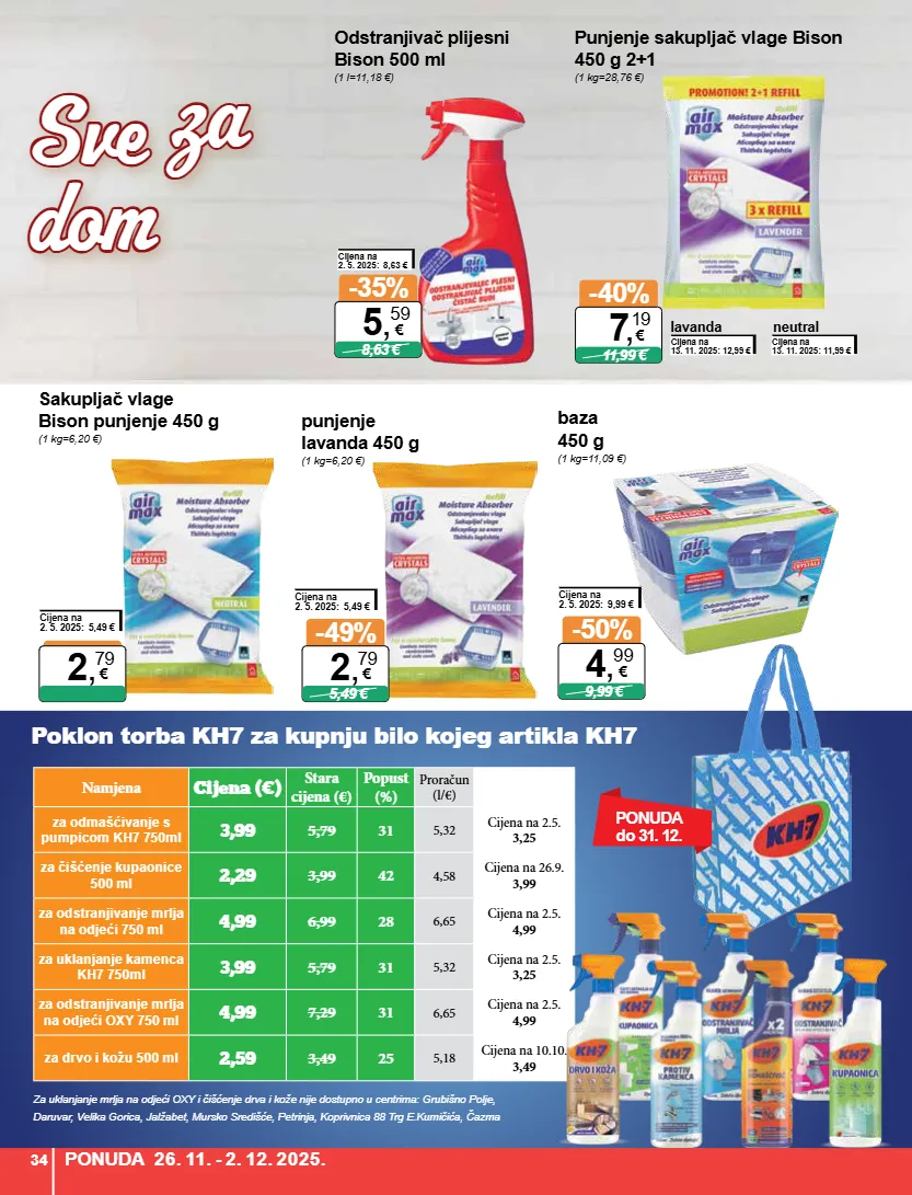 sve sve za za dom dom ponuda 26. 11. - 2. 12. 2025. 34 namjena cijena (€) stara cijena (€) popust (%) proračun (l/€) za odmašćivanje s pumpicom kh7 750ml 3,99 5,79 31 5,32 cijena na 2.5. 3,25 za čišćenje kupaonice 500 ml 2,29 3,99 42 4,58 cijena na 26.9. 3,99 za odstranjivanje mrlja na odjeći 750 ml 4,99 6,99 28 6,65 cijena na 2.5. 4,99 za uklanjanje kamenca kh7 750ml 3,99 5,79 31 5,32 cijena na 2.5. 3,25 za odstranjivanje mrlja na odjeći oxy 750 ml 4,99 7,29 31 6,65 cijena na 2.5. 4,99 za drvo i kožu 500 ml 2,59 3,49 25 5,18 cijena na 10.10. 3,49 cijena na 13. 11. 2025: 11,99 € cijena na 13. 11. 2025: 12,99 € cijena na 2. 5. 2025: 5,49 € cijena na 2. 5. 2025: 5,49 € cijena na 2. 5. 2025: 9,99 € cijena na 2. 5. 2025: 8,63 € punjenje sakupljač vlage bison 450 g 2+1 (1 kg=28,76 €) -40% 11,99 € 7 , 19 € sakupljač vlage bison punjenje 450 g (1 kg=6,20 €) 2 , 79 € punjenje lavanda 450 g (1 kg=6,20 €) -49% 5,49 € 2 , 79 € baza 450 g (1 kg=11,09 €) -50% 9,99 € 4 , 99 € odstranjivač plijesni bison 500 ml (1 l=11,18 €) -35% 8,63 € 5 , 59 € ponuda do 31. 12. poklon torba kh7 za kupnju bilo kojeg artikla kh7 za uklanjanje mrlja na odjeći oxy i čišćenje drva i kože nije dostupno u centrima: grubišno polje, daruvar, velika gorica, jalžabet, mursko središće, petrinja, koprivnica 88 trg e.kumičića, čazma lavanda neutral