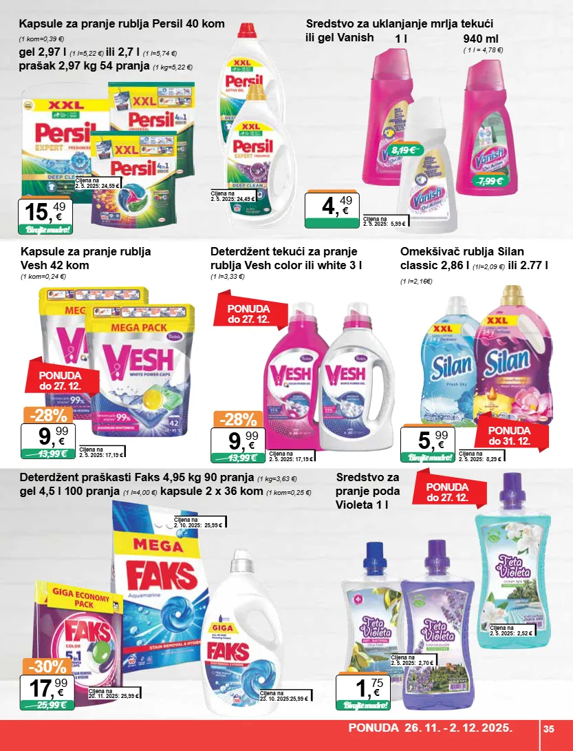 35 ponuda 26. 11. - 2. 12. 2025. 1 l cijena na 2. 5. 2025: 17,19 € cijena na 2. 5. 2025: 17,19 € cijena na 2. 5. 2025: 2,70 € cijena na 2. 5. 2025: 2,52 € cijena na 2. 5. 2025: 24,59 € cijena na 2. 5. 2025: 24,49 € cijena na 2. 5. 2025: 8,29 € cijena na 2. 10. 2025: 25,99 € cijena na 23. 10. 2025:25,99 € cijena na 20. 11. 2025: 25,99 € cijena na 2. 5. 2025: 5,99 € deterdžent tekući za pranje rublja vesh color ili white 3 l (1 l=3,33 €) ponuda do 27. 12. ponuda do 27. 12. ponuda do 31. 12. ponuda do 27. 12. -28% 13,99 € 9 , 99 € kapsule za pranje rublja vesh 42 kom (1 kom=0,24 €) -28% 13,99 € 9 , 99 € sredstvo za pranje poda violeta 1 l birajte mudro! 1 , 75 € kapsule za pranje rublja persil 40 kom (1 kom=0,39 €) gel 2,97 l (1 l=5,22 €) ili 2,7 l (1 l=5,74 €) prašak 2,97 kg 54 pranja (1 kg=5,22 €) birajte mudro! 15 , 49 € omekšivač rublja silan classic 2,86 l (1l=2,09 €) ili 2.77 l (1 l=2,16€) birajte mudro! 5 , 99 € deterdžent praškasti faks 4,95 kg 90 pranja (1 kg=3,63 €) gel 4,5 l 100 pranja (1 l=4,00 €) kapsule 2 x 36 kom (1 kom=0,25 €) -30% 25,99 € 17 , 99 € sredstvo za uklanjanje mrlja tekući ili gel vanish 4 , 49 € 8,19 € 7,99 € 940 ml ( 1 l = 4,78 €)