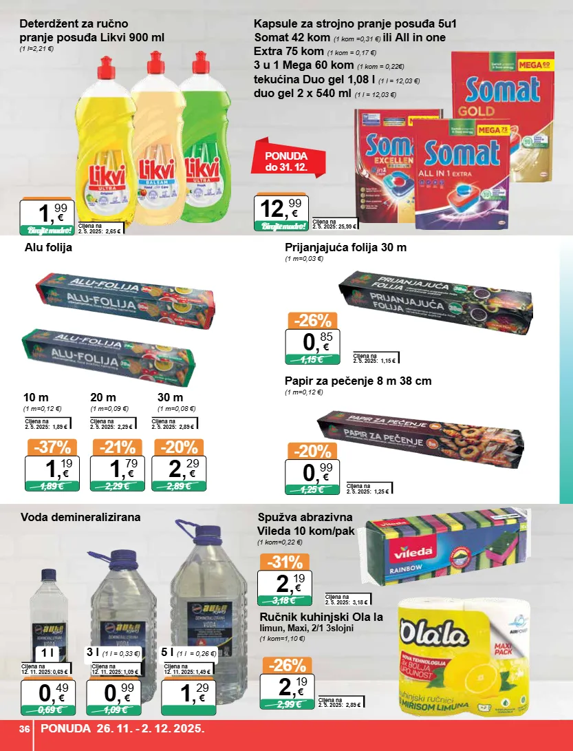 ponuda 26. 11. - 2. 12. 2025. 36 cijena na 2. 5. 2025: 3,18 € cijena na 2. 5. 2025: 1,89 € cijena na 2. 5. 2025: 2,29 € cijena na 2. 5. 2025: 2,89 € cijena na 2. 5. 2025: 1,15 € cijena na 2. 5. 2025: 1,25 € cijena na 2. 5. 2025: 2,89 € cijena na 12. 11. 2025: 0,69 € cijena na 12. 11. 2025: 1,09 € cijena na 12. 11. 2025: 1,49 € cijena na 2. 5. 2025: 25,99 € cijena na 2. 5. 2025: 2,65 € spužva abrazivna vileda 10 kom/pak (1 kom=0,22 €) alu folija 10 m (1 m=0,12 €) 20 m (1 m=0,09 €) 30 m (1 m=0,08 €) prijanjajuća folija 30 m (1 m=0,03 €) papir za pečenje 8 m 38 cm (1 m=0,12 €) -31% 3,18 € 2 , 19 € -37% 1,89 € 1 , 19 € -21% 2,29 € 1 , 79 € -20% 2,89 € 2 , 29 € -26% 1,15 € 0 , 85 € -20% 1,25 € 0 , 99 € ručnik kuhinjski ola la limun, maxi, 2/1 3slojni (1 kom=1,10 €) -26% 2,99 € 2 , 19 € voda demineralizirana 1 l 3 l (1 l = 0,33 €) 5 l (1 l = 0,26 €) 0,69 € 0 , 49 € 1,09 € 0 , 99 € 1 , 29 € ponuda do 31. 12. kapsule za strojno pranje posuđa 5u1 somat 42 kom (1 kom =0,31 €) ili all in one extra 75 kom (1 kom = 0,17 €) 3 u 1 mega 60 kom (1 kom = 0,22€) tekućina duo gel 1,08 l (1 l = 12,03 €) duo gel 2 x 540 ml (1 l = 12,03 €) birajte mudro! 12 , 99 € deterdžent za ručno pranje posuđa likvi 900 ml (1 l=2,21 €) birajte mudro! 1 , 99 €
