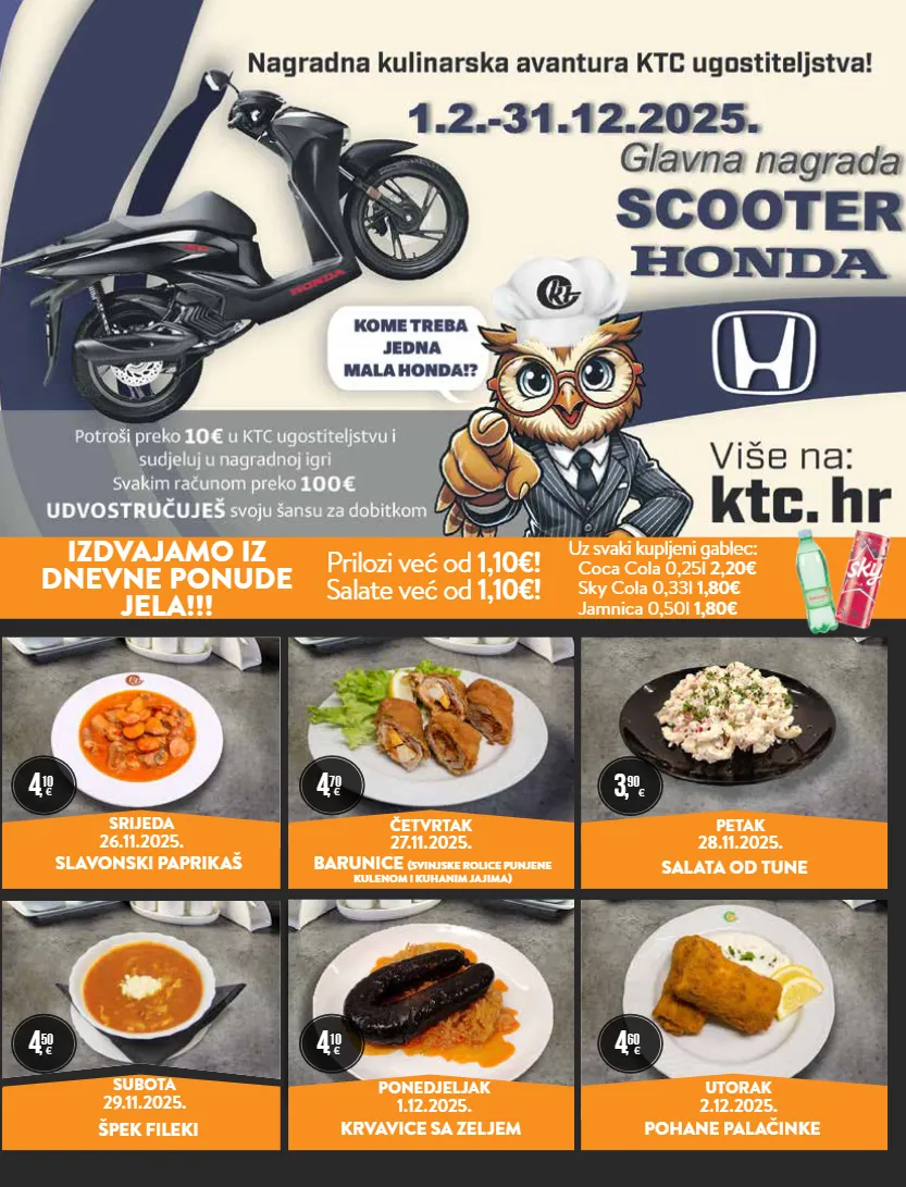 kn četvrtak 27.11.2025. zelena tjestenina s plodovima mora utorak 2.12.2025. ponedjeljak 1.12.2025. subota 29.11.2025. krvavice sa zeljem pohane palačinke špek fileki izdvajamo iz dnevne ponude jela!!! petak 28.11.2025. salata od tune 4 , 10 € 4 , 70 € 4 , 50 € 3, 90 € 4 , 60 € srijeda 26.11.2025. barunice (svinjske rolice punjene kulenom i kuhanim jajima) slavonski paprikaš coca cola 0,25l 2,20€ sky cola 0,33l 1,80€ jamnica 0,50l 1,80€ prilozi već od 1,10€! salate već od 1,10€! uz svaki kupljeni gablec: 4 , 10 €