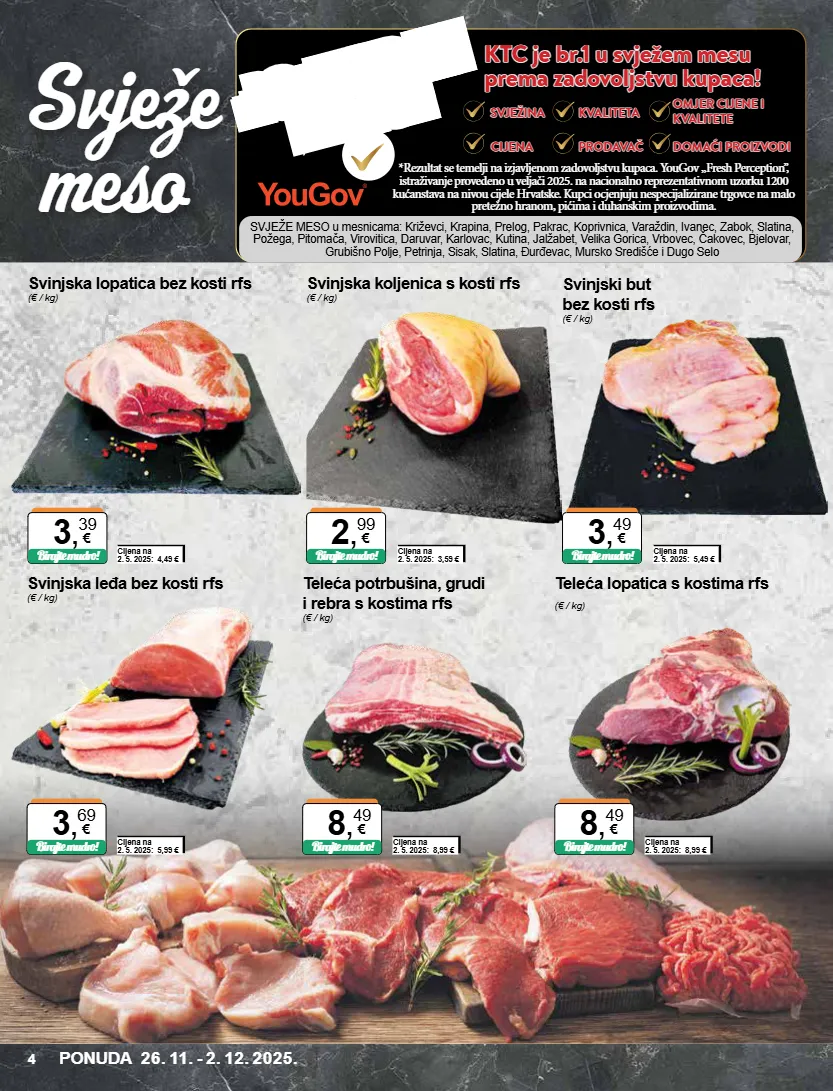 ponuda 26. 11. - 2. 12. 2025. 4 svježe meso svježe meso u mesnicama: križevci, krapina, prelog, pakrac, koprivnica, varaždin, ivanec, zabok, slatina, požega, pitomača, virovitica, daruvar, karlovac, kutina, jalžabet, velika gorica, vrbovec, čakovec, bjelovar, grubišno polje, petrinja, sisak, slatina, đurđevac, mursko središće i dugo selo ktc je br.1 u svježem mesu ktc je br.1 u svježem mesu prema zadovoljstvu kupaca! prema zadovoljstvu kupaca! *rezultat se temelji na izjavljenom zadovoljstvu kupaca. yougov „fresh perception”, istraživanje provedeno u veljači 2025. na nacionalno reprezentativnom uzorku 1200 kućanstava na nivou cijele hrvatske. kupci ocjenjuju nespecijalizirane trgovce na malo pretežno hranom, pićima i duhanskim proizvodima. domaći proizvodi domaći proizvodi omjer cijene i omjer cijene i kvalitete kvalitete prodavač prodavač kvaliteta kvaliteta svježina svježina cijena cijena potvrdili kupci cijena na 2. 5. 2025: 4,49 € cijena na 2. 5. 2025: 5,99 € cijena na 2. 5. 2025: 8,99 € cijena na 2. 5. 2025: 8,99 € cijena na 2. 5. 2025: 3,59 € cijena na 2. 5. 2025: 5,49 € svinjski but bez kosti rfs (€ / kg) birajte mudro! 3 , 49 € svinjska lopatica bez kosti rfs (€ / kg) svinjska koljenica s kosti rfs (€ / kg) svinjska leđa bez kosti rfs (€ / kg) teleća potrbušina, grudi i rebra s kostima rfs (€ / kg) teleća lopatica s kostima rfs (€ / kg) birajte mudro! 3 , 39 € birajte mudro! 2 , 99 € birajte mudro! 3 , 69 € birajte mudro! 8 , 49 € birajte mudro! 8 , 49 €